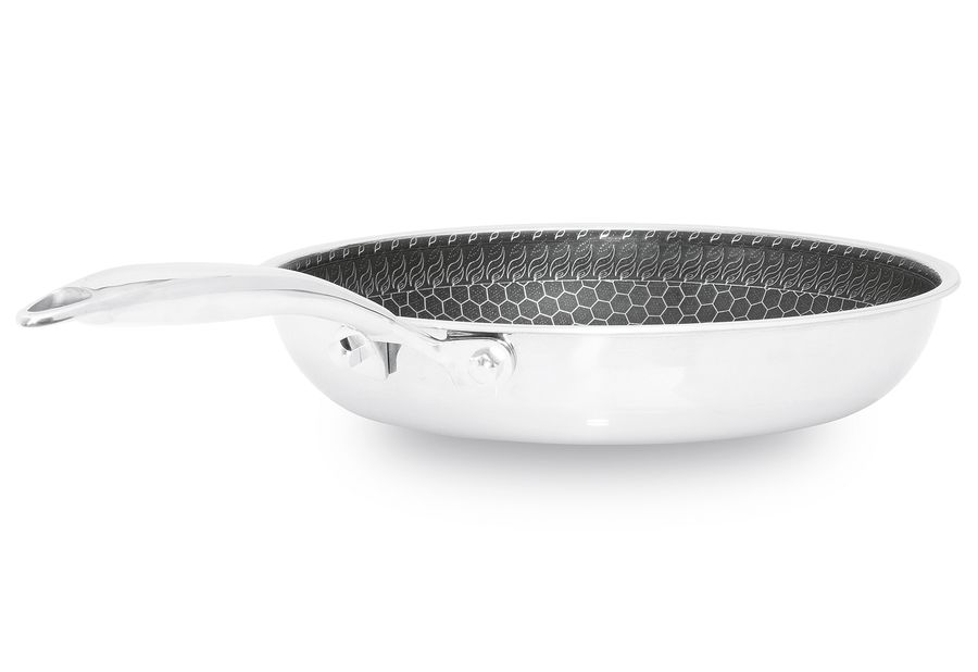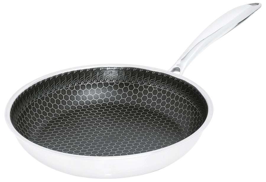 Edelstahl / Aluminium / Antihaftbeschichtung, langer Edelstahl Griff mit Henssler Gravur, geeignet für alle Herdarten einschließlich Induktion, im Handumdrehen heiß, hitzebeständig und backofenfest bis 230°C, die Wabenstruktur unterstützt die gleichmäßige Verteilung und reguliert die Zufuhr über die gesamte Pfannenfläche, ohne dass zu bratende Zutaten anhaften und verbrennen, durch mehrere Schichten aus Edelstahl und Aluminium sowie die Antihaftbeschichtung wird eine 60% verbesserte Verteilung der Hitze als bei einer einschichtigen Edelstahlpfanne erreicht, durch die gleichmäßige und lange Wärmeverteilung wird jedes Gericht, egal ob Fleisch, Fisch oder Gemüse, auf den Punkt genau gebraten bzw. gegart Ø 24 cm