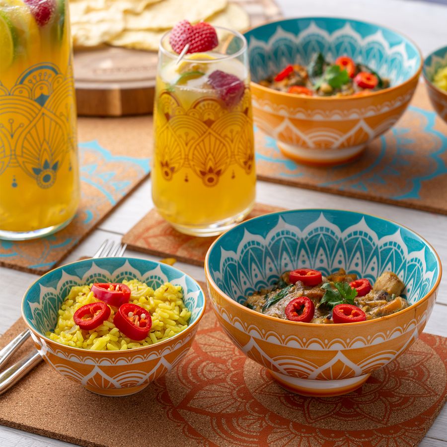 Die Typhoon World Foods India Schale peppt jeden Esstisch auf. Schön detailliert mit einem trendigen Mandala-Muster in leuchtenden Farben, wird jede Schale Spaß und Farbe zu indisch inspirierten Mahlzeiten hinzufügen. Der Durchmesser von 15 cm ist perfekt zum Servieren von Dips und einzelnen Portionen Reis sowie zum Aufbewahren von geschmackvollen Resten. Die Schale ist sowohl praktisch als auch stilvoll. Die World Foods India Bowl ist aus hochwertigem Steingut gefertigt und mit einer dauerhaften farbigen Glasur versehen. Sie ist resistent gegen Absplitterungen und Risse und hält so dem täglichen Gebrauch stand. Die India Schale ist sowohl für den Gefrierschrank als auch für die Mikrowelle geeignet und spülmaschinenfest. Sie ist vielseitig einsetzbar und kann zur einfachen Aufbewahrung gestapelt werden. Die Typhoon World Foods Kollektion umfasst Koch- und Serviergeschirr für alle, die gerne kochen oder Gerichte aus aller Welt servieren.