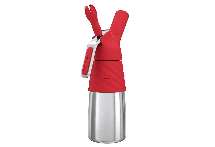 Edelstahl / Silikon, spülmaschinenfest (ausgenommen Kunststofftüllen), Flaschenkörper aus europäischem Edelstahl, Gerätekopf und Kapselhalter aus Premium Edelstahl, Flasche und -Kopf z.T. silikonummantelt, Flaschencover mit trendigem Wave-Design und Kapselhalter aus Silikon, nur für kalte Anwendungen geeignet, das geschlossene System erlaubt, die kalten Zubereitungen mehrere Tage bei gleichbleibender Qualität ohne Zusatz von Konservierungsstoffen im Kühlschrank zu lagern, inklusive 2 iSi Professional Chargers, 2 Garniertüllen (Stern, Tulpe) aus hochwertigem Kunststoff, 1 Rezeptheft, 1 Kapselhalter und 1 Reinigungsbürste, nicht für den professionellen Einsatz in der Gastronomie geeignet·red 500 ml, (LxBxH): 9,5x8,8x31,1 cm