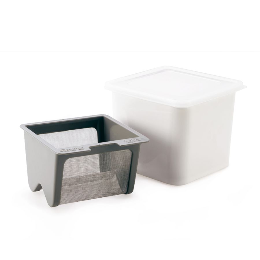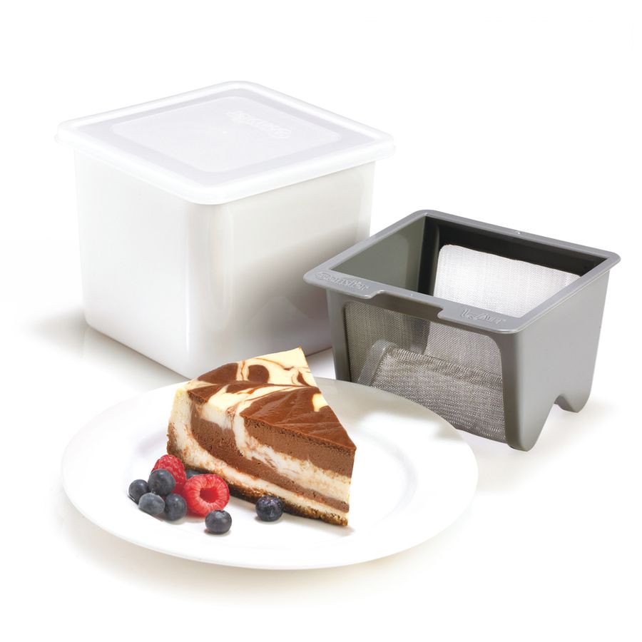 Frischkäsebereiter. Kreieren Sie dicken, cremigen Frischkäse mit diesem gestaltetem Sieb. Dieser Frischkäsezubereiter macht aus Joghurt cremige Dips, Aufstriche und Speiseeis. Zaubern Sie fettarme, kalziumreiche Dips, Salatdressing, Brotaufstriche und Käsekuchen. Dank dem gestaltetem Sieb dieses Frischkäsezubereiters kreieren Sie dicken, cremigen Frischkäse ohne großen Aufwand. Fügen Sie einfach Joghurt hinzu und das e patentierte Design stellt für Sie Frischkäse in 2 bis 24 Stunden her. Cuisipro Frischkäsebereiter, Kunststoff. Kein Tuch oder Abschöpfen der Flüssigkeit nötig.