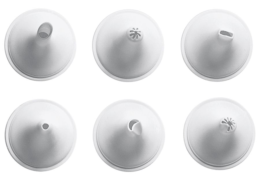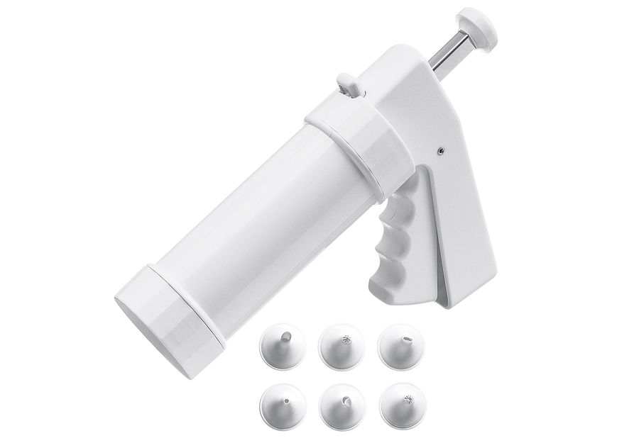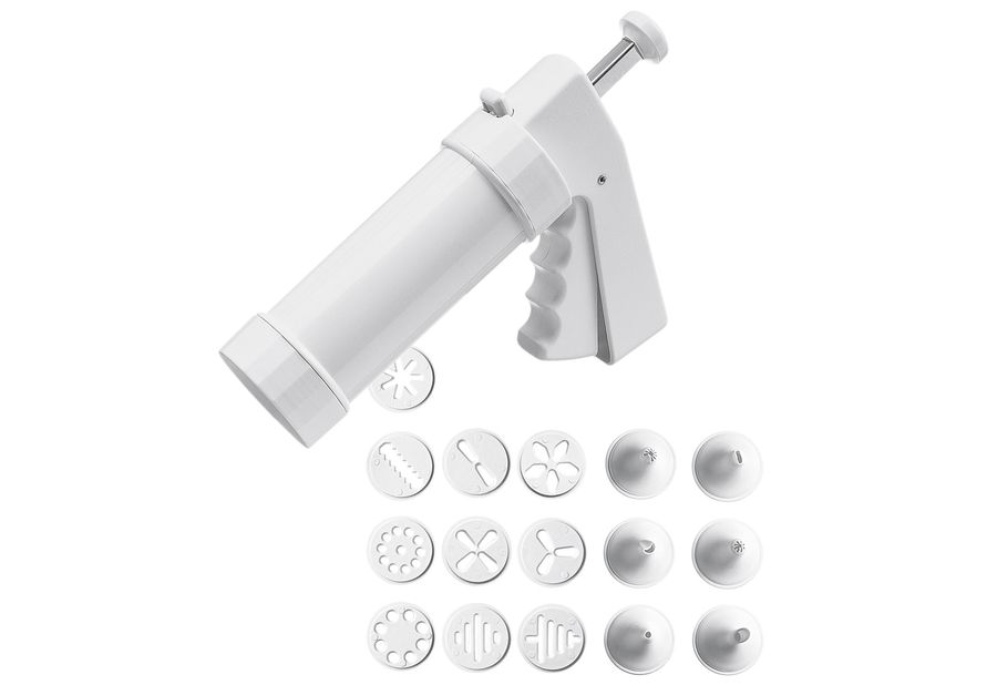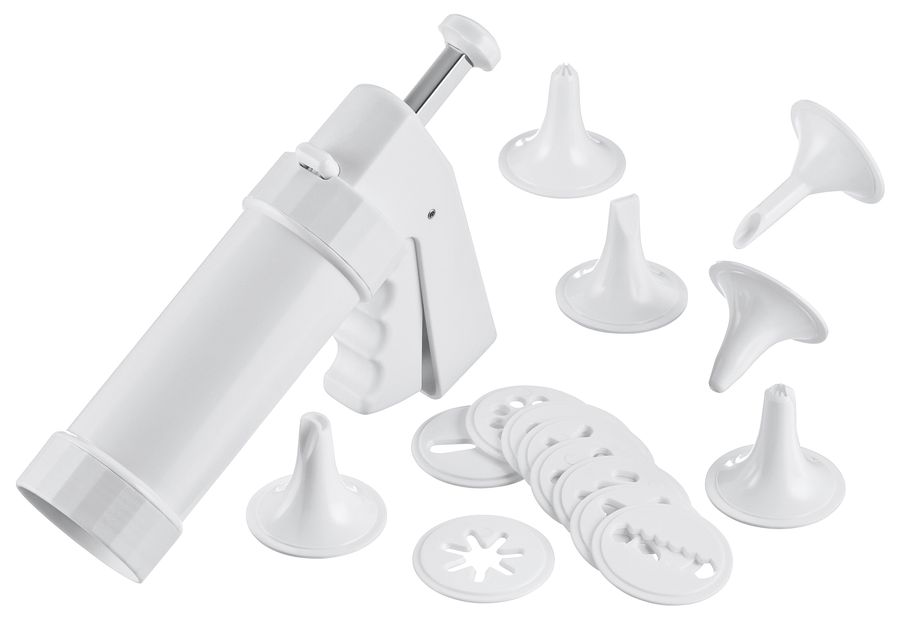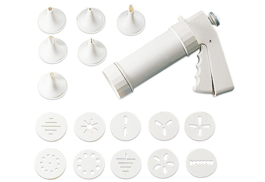 Inhalt: 1 Gebäckpresse, 10 x Formscheiben und 6 x Garniertüllen