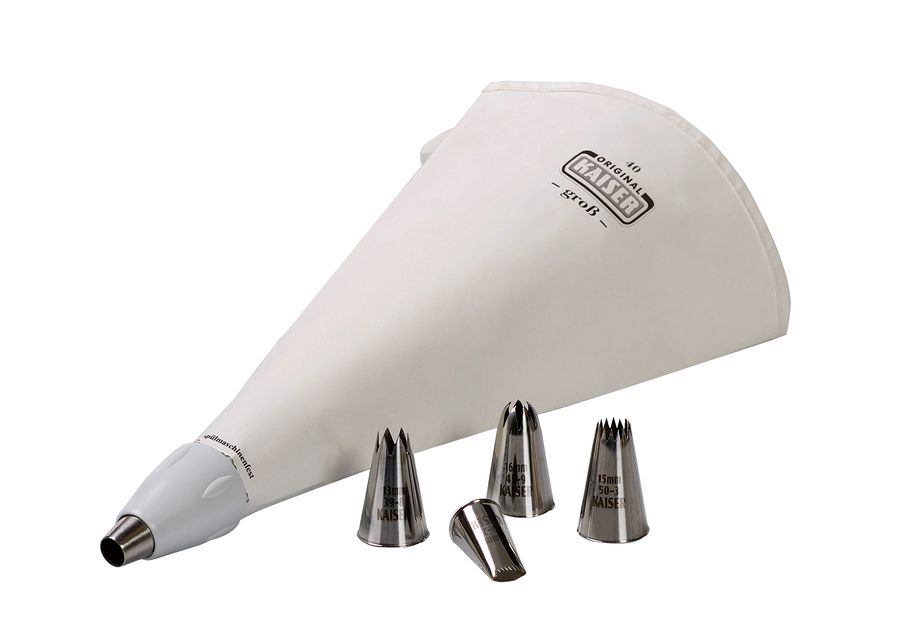 Inhalt: 1 x kochfester Spritzbeutel 40 cm, 1 x Adapter, 5 x Edelstahltüllen aus einem Stück gezogen (Lochtülle Ø 13 mm, Sterntülle Ø 13 cm, Sterntülle geschlossen Ø 16 cm, Kronentülle Ø 15 mm, Sternbandtülle Ø 16 cm), erweiterbar mit jeder Edelstahltülle des Original-Kaiser Creativ Deko-Center-Sortimentes
