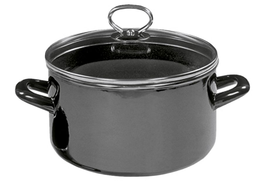 Emaille / Edelstahl / Glas, , Materialstärke 1,5 mm, schweres Geschirr, Bodendekor in weiß, innen: Diamant-Glasur, Glasdeckel mit Edelstahlrand und Dampfaustrittsöffnung, emaillierte Hohlgriffe, Bügelgriff am Glasdeckel aus Edelstahl, für alle Herdarten geeignet inkl. Induktions-Kochfelder·schwarz Ø 16 cm