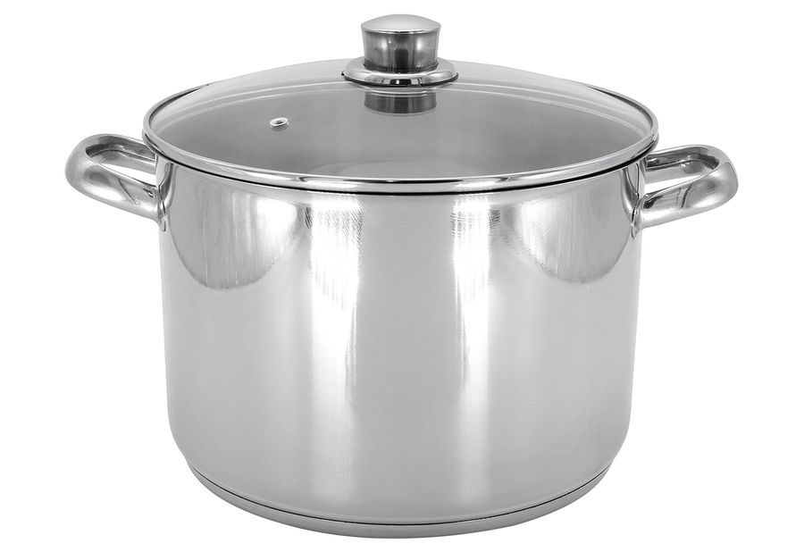 Edelstahl rostfrei / Aluminium, Kapselboden, Wandstärke 0,6 mm, Bodenstärke 3 mm, gebördelter Rand, Glasdeckel mit Rundknopf, Hohlgriffe, in Folie eingeschweißt, für alle Herdarten inkl. Induktion geeignet, spülmaschinenbeständig 10 l, Ø 26 cm, H 18 cm