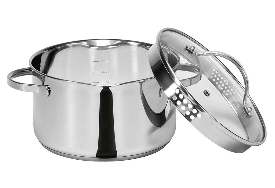 Edelstahl rostfrei, mit Ausguss, Kapselboden, innen und außen hochglanzpoliert, innen mit Literskala, gebördelter Rand mit zwei gegenüberliegenden Ausgüssen, Glasdeckel mit Dampfloch und verlängerten Abseihöffnungen, für alle Herdarten inkl. Induktion geeignet 1,5 l, Ø 16 cm