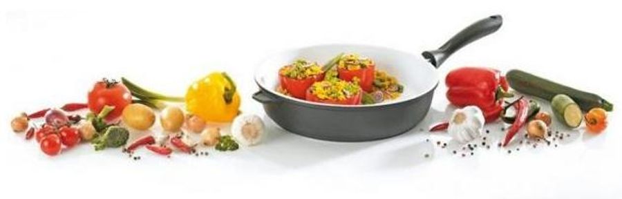 Aluguss, CERAMIK-Beschichtung, Kunststoffgriffe bis 180°C hitzebeständig, hohe Kratz- u. Temperaturbeständigkeit, PTFE frei, leicht zu reinigende Oberfläche, ergonomischer Pfannengriff, für alle Herdarten inkl. Induktion geeignet· Ø 28 cm, H 7 cm
