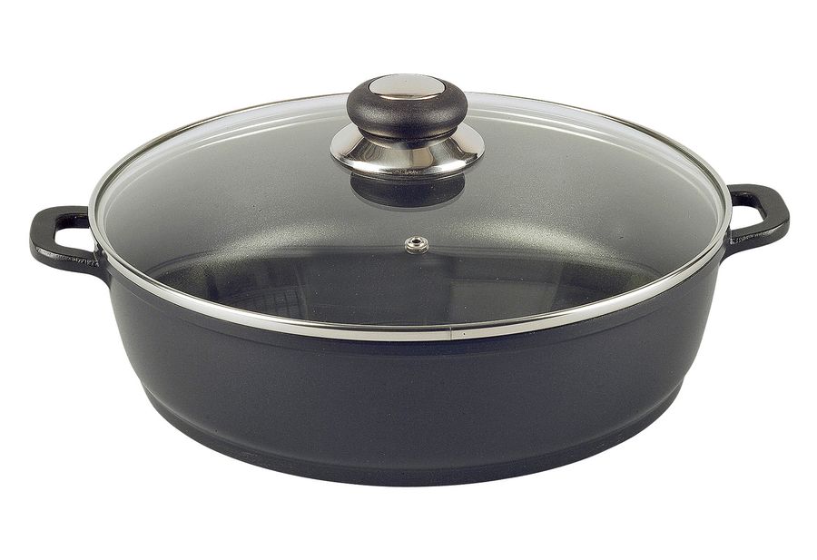Aluguss, Bodenstärke ca. 5 mm, Materialstärke ca. 2,2 mm, antihaftversiegelt, mit Glasdeckel, Edelstahlschutzrand und Lüftungsloch, für alle Herdarten inkl. Induktion geeignet· Ø 28 cm, H 7,5 cm