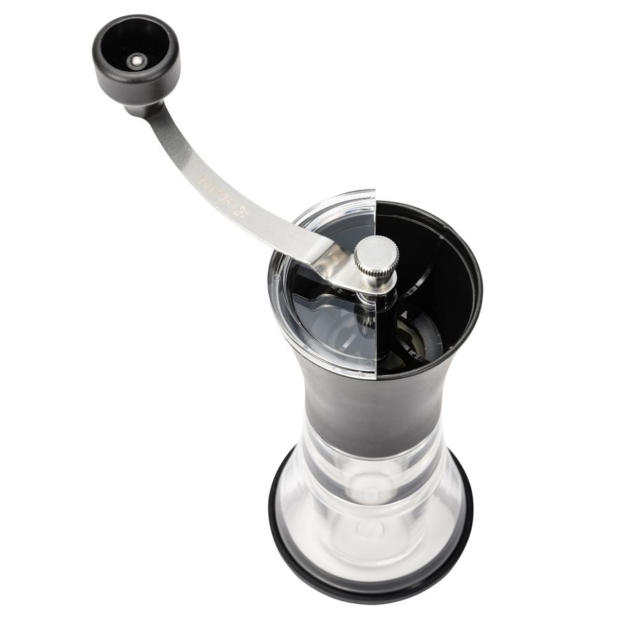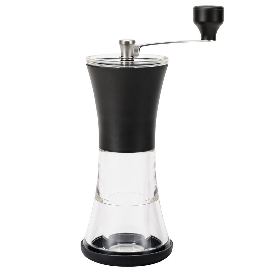 "Schlanke keramische Kaffeemühle." Diese Mühle hat einen Acryl-Basisbehälter mit einer Kapazität für 30g gemahlenen Kaffee. Die schlanke Ausführung ist ideal zu halten und einfach im Gebrauch. Die Kaffeemühle hat einen fortschrittlichen keramischen Mahlmechanismus, der nie korrodieren wird, liefert frische Resultate und haltbare Leistung. Mit der Wahlvorrichtung kann nach Ihren Wünschen von fein bis grob eingestellt werden. Die rutschfeste Silikonbasis sorgt für ein stabiles Schleifen. Eine zweiteilige Abdeckung für einfaches Füllen. Keine Notwendigkeit, den Griff zu entfernen. Der keramische Schleifmechanismus und andere Edelstahlteile sind völlig waschbar. Die Mühle ist nur für getrocknete Kaffeebohnen. Verwenden Sie keine Haushalt-Bleichmittel. Nicht in eine Spülmaschine geben.