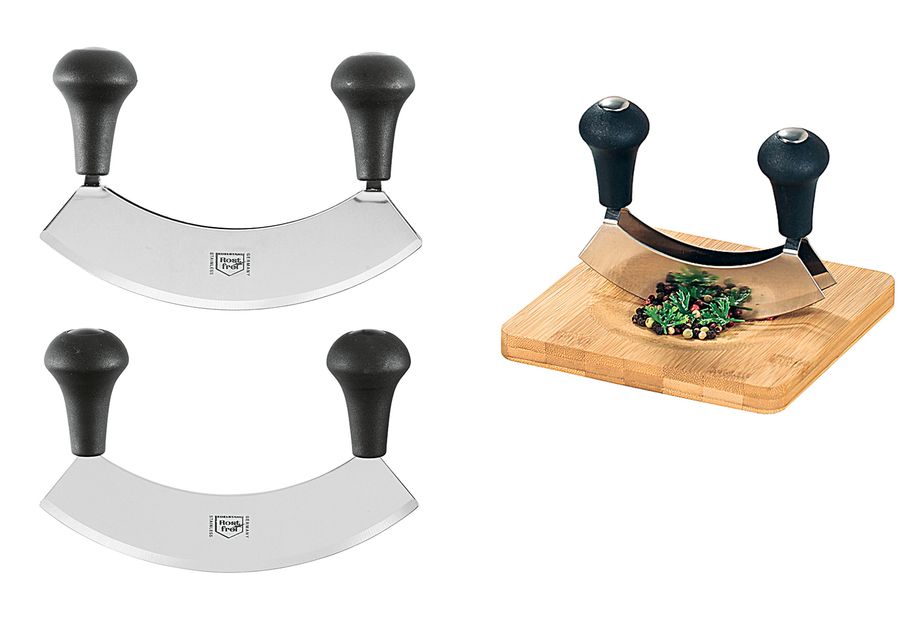 Bambus, Arbeitsmulde im Brett, vier rutschfeste Füße, Wiegemesser mit doppelter Edelstahl-Klinge und schwarzen Kunststoffgriffen, Handreinigung empfohlen· (LxBxH):16x16x1,8 cm