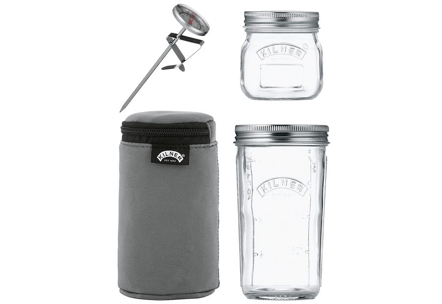 Glas / Neopren, zur Herstellung von Joghurt einfach Übernacht, ohne Strom, Inhalt: 1 x Glas mit Deckel 500 ml, 1 x Glas mit Deckel 250 ml zum späteren Umfüllen in kleinere Portionen, 1 Neopren-Isolierbeutel für das Halten der passenden Temperatur, während des Herstellungsprozesses, 1 Thermometer zur Temperatur-Kontrolle beim Einfüllen, ob vegane oder normale Milch – einfach kurz im Kochtopf erwärmen, ins Glas füllen, die Joghurtkulturen (aus Joghurt oder Joghurtpulver) hinzufügen und das Glas im Neoprenbeutel für 8-10 Stunden ruhen lassen - schon nach nur 10 Stunden ist der Joghurt fertig 500 ml·Fachhandel exklusiv·