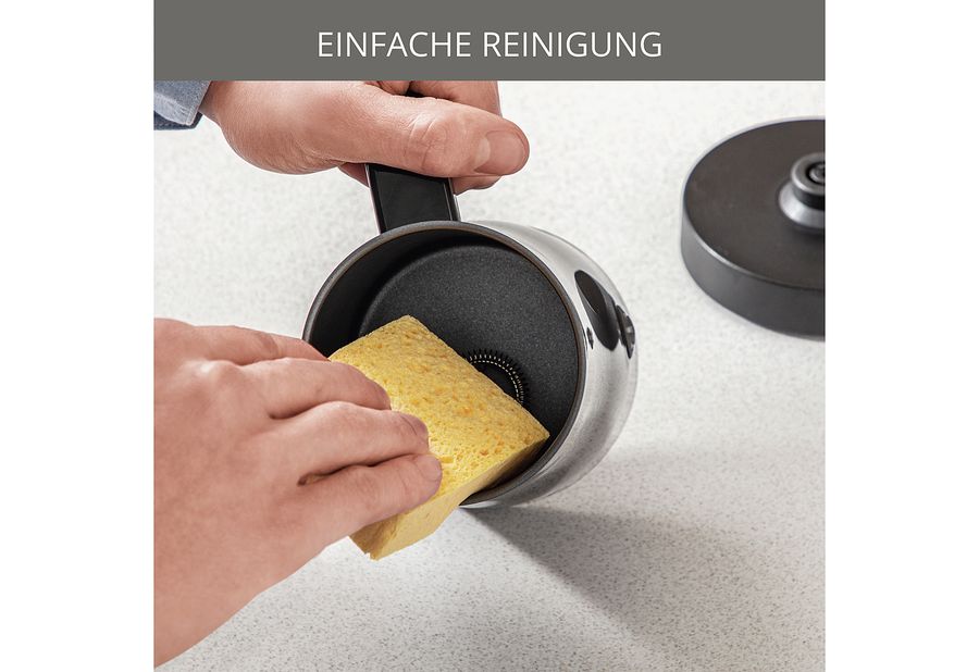 einfache Bedienung per Knopfdruck, 360° Sockel mit Zentralkontakt, Innenbehälter antihaftbeschichtet, Aufschäumkapazität 150 ml, abnehmbarer magnetischer Aufschäumaufsatz, automatische Abschaltung nach dem Aufschäumen