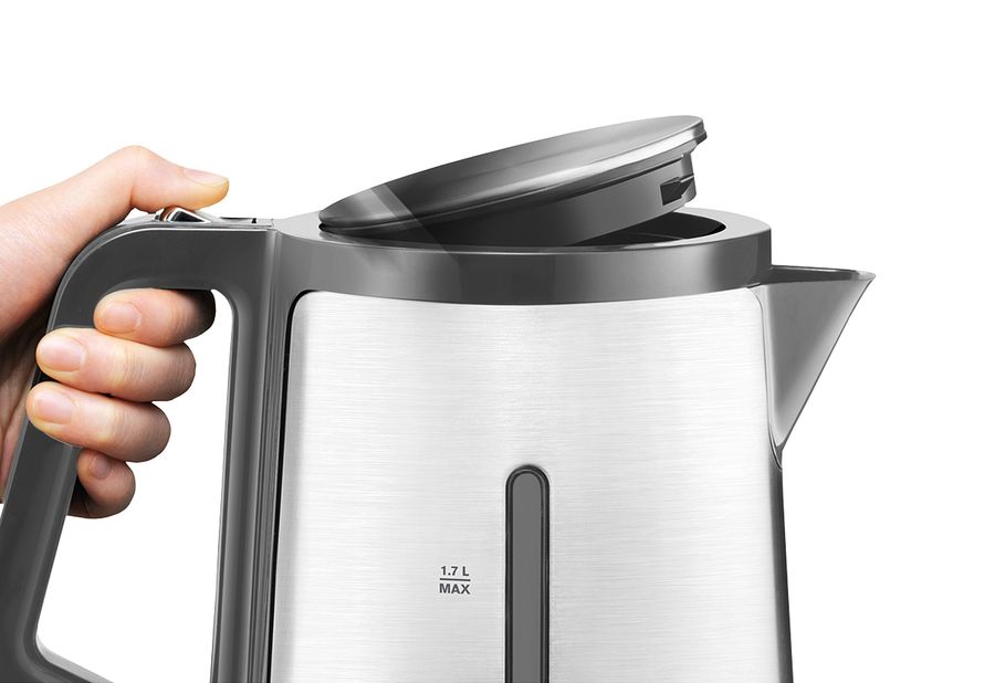 Fassungsvermögen: 1,7 l, Design-Wasserkocher aus Edelstahl, automatische Öffnung des Deckels per Knopfdruck, abgedecktes Heizelement, großer Drehverschluss für leichtes Befüllen, 360° Sockel, beleuchteter Ein- / Ausschalter, 2 außen liegende Wasserstandsanzeigen, herausnehmbarer Anti-Kalkfilter, Trockengeh- / Überhitzungsschutz, 2400 Watt, Schukostecker CEE 7/7·edelstahl/schwarz