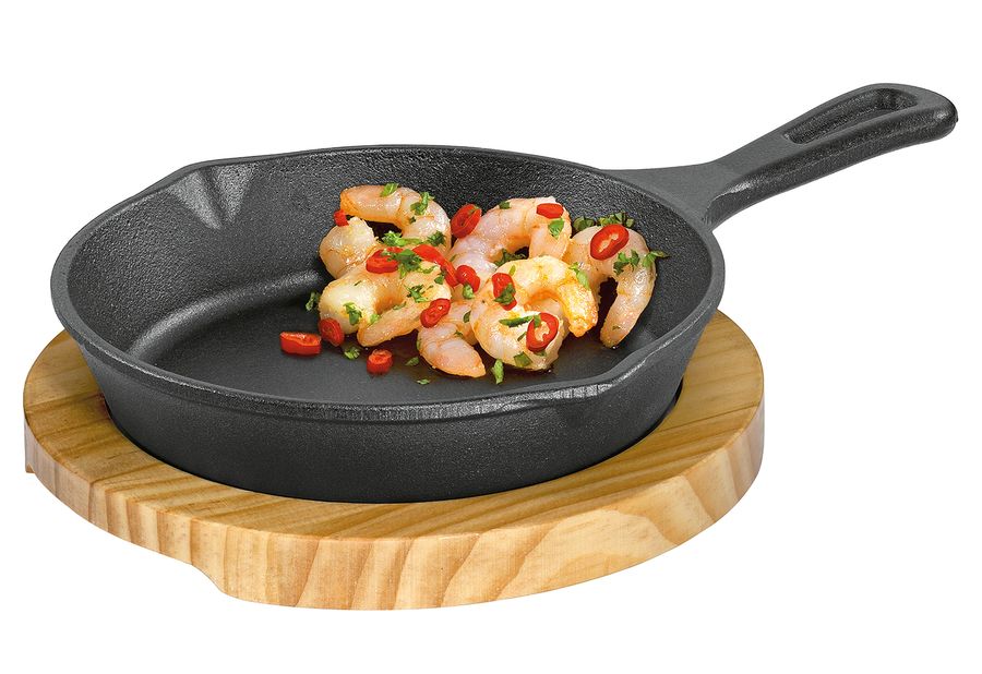 Gusseisen / Pinienholz, mit Stielgriff, geeignet für Grill, Backofen und alle Herdarten, mit Holzbrett zum stilvollen Servieren·grau / natur 1 kg, 300 ml, (LxBxH): 26x18x6 cm·Fachhandel exklusiv·