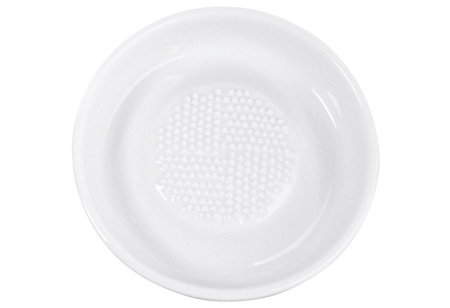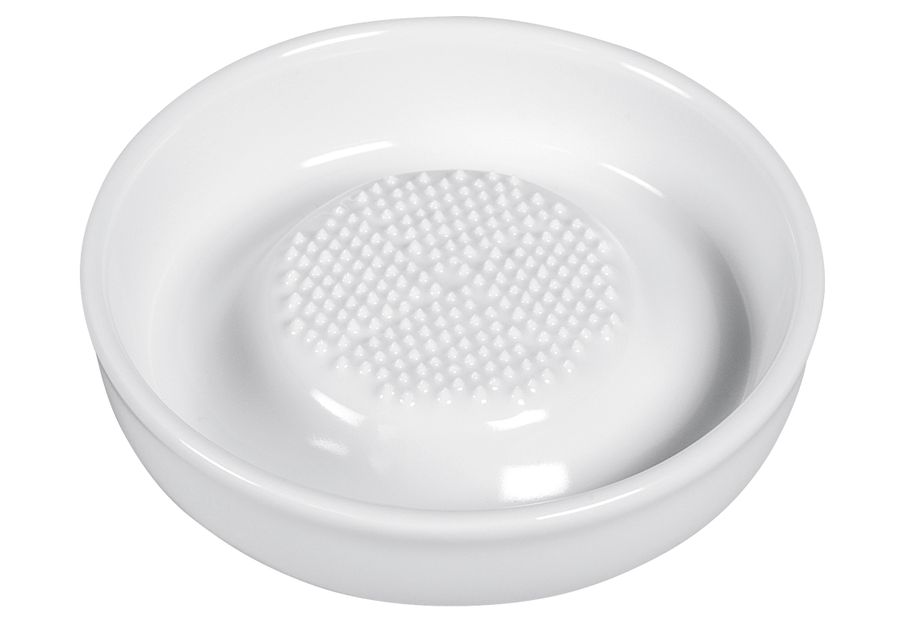 Keramik, mit scharfen Zähnen, Wurzeln wie Ingwer lassen sich dadurch schnell zerkleinern, die unerwünschten Fasern bleiben zurück, die nicht korrosive Schale sammelt das Reibgut, und die würzigen Säfte, ohne den Geschmack zu verändern, auch ideal für "Elefantenknoblauch", zur einfachen Bedienung ist ein Silikonring darunter angebracht, der hält die Reibe bei der Nutzung fest·weiß Ø 9,3 cm·Fachhandel exklusiv·