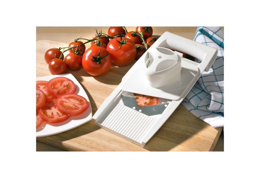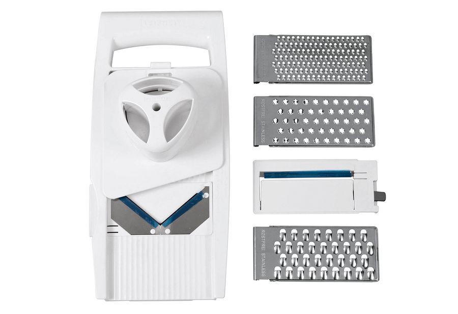 ABS / Edelstahlklinge, mit 5 Einsätzen: grobe und feine Gemüsereibe, Kartoffelreibe, verstellbarem Schneidmesser für unterschiedlich dicke Scheiben und v-förmigem Tomatenmesser, mit Restehalter, spülmaschinenfest, 3 Jahre Garantie· (LxBxH): 32,7x13,4x7 cm
