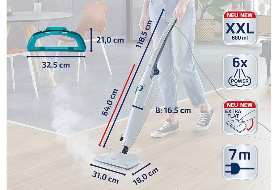 Beseitigt 99,99 % der Viren und Bakterien, gleichmäßige Dampfverteilung aus 6 Power-Steam-Düsen entfernt über die komplette Fläche Schmutz und Keime, reinigt mit heißem Wasserdampf, nicht mit Chemie und ist somit sehr umweltschonend, Dank der kurzen Aufheizzeit von weniger als 30 Sekunden ist er sehr schnell einsatzbereit und mühsame Vorbereitungsschritte wie Eimer füllen und schleppen fallen weg