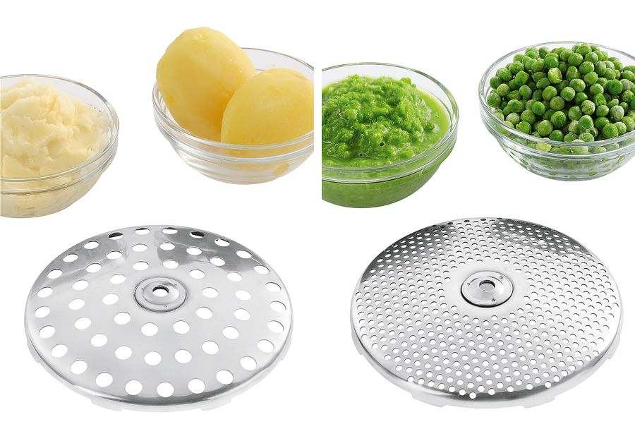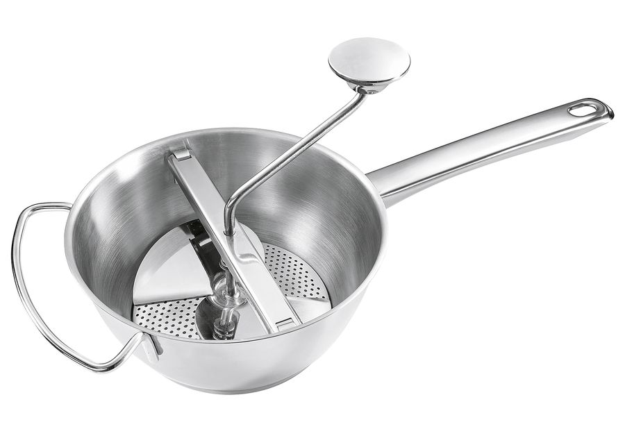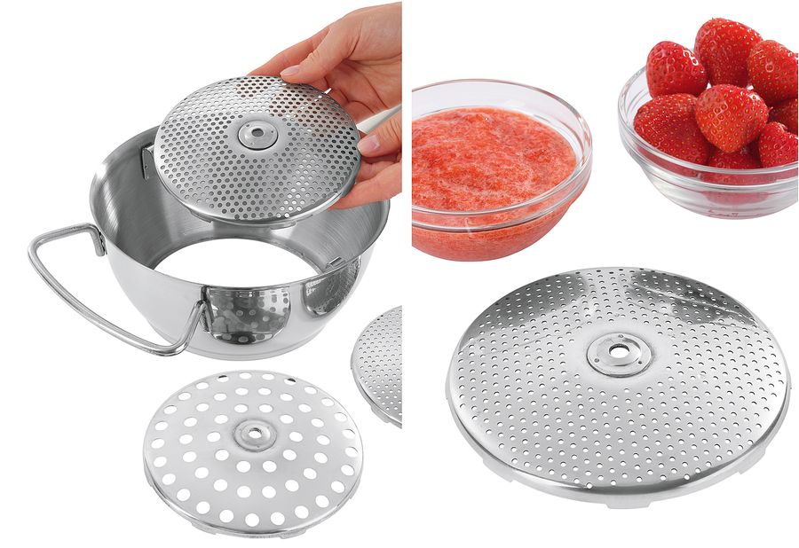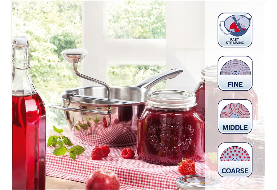 Edelstahl, einfache Handhabung beim Passieren von Obst und Gemüse für Babynahrung, Marmeladen, Gelees, Kompott, Kartoffelbrei, Suppen und Soßen, schnelles Passieren dank zweiflügeligem Rotor, rostfrei und spülmaschinengeeignet, sichere Dreipunktauflage, inklusive drei Passier-Scheiben mit Lochgrößen fein (2mm), mittel (3mm) und grob (8mm) Ø 20 cm