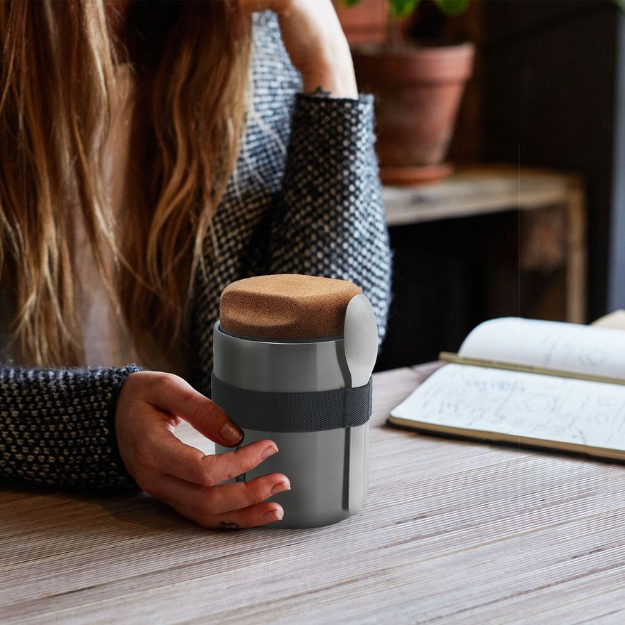 Der vakuumisolierte Lunchbecher Food Flask von black+blum hält die Lebensmittel bis zu 6 Stunden warm und für bis zu 8 Stunden kalt. Er ist ideal für die Mitnahme von heißen Speisen wie Pasta, Risotto oder auch Suppe - denn der Thermobecher ist absolut auslaufsicher. Das kompakte Design und die große Öffnung sind besonders praktisch für die Mitnahme, sowie auch für den komfortablen Verzehr von Mahlzeiten. Der Deckel ist aus Naturkork zur idealen Isolierung der großen Öffnung. Der beiliegende Löffel ist aus Edelstahl.