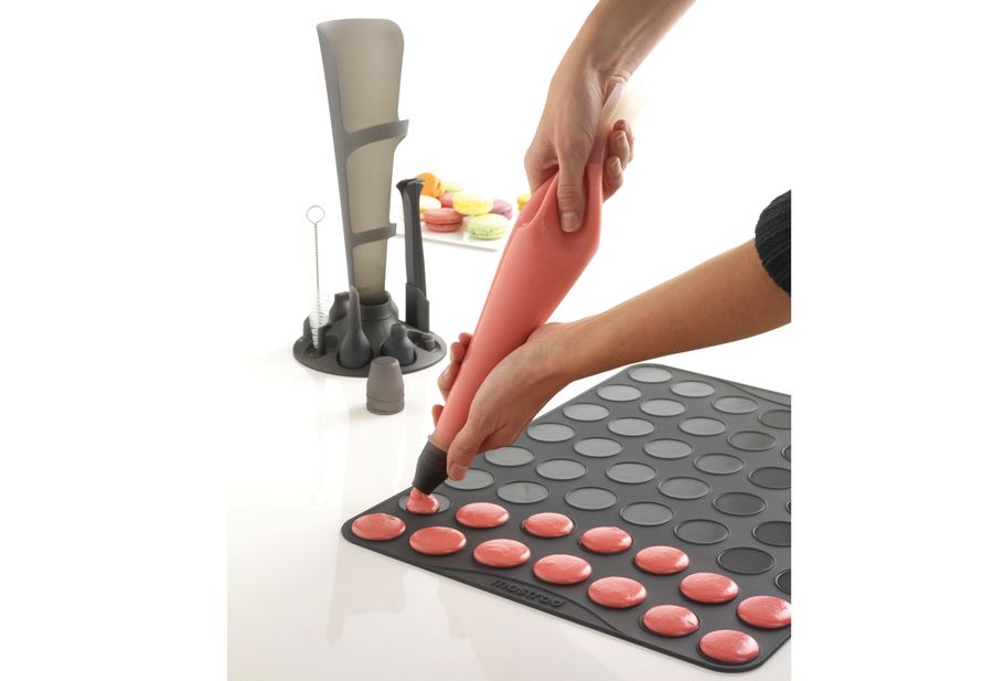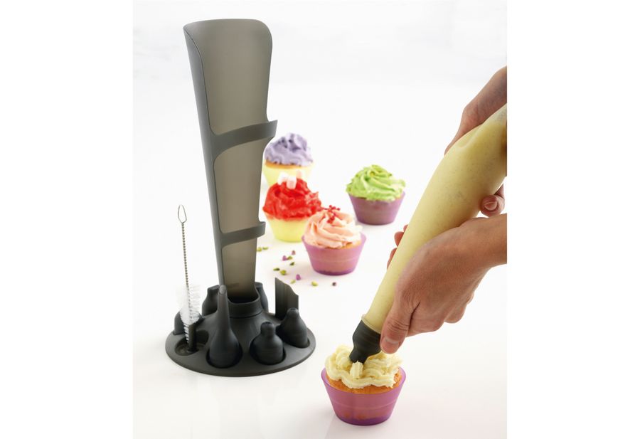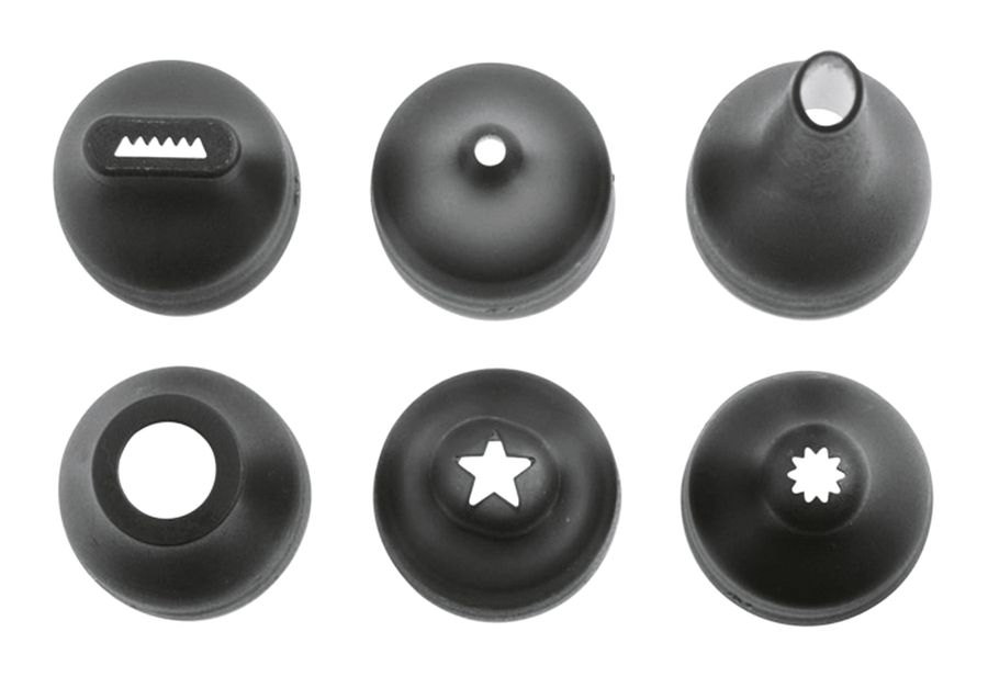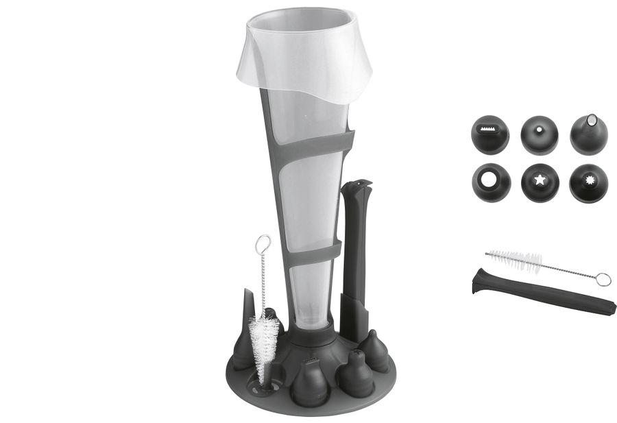 Silikon, Inhalt: 1 Spritzbeutel 500 ml, 1 Spritzbeutel 1 l, 1 Träger, 6 Tüllen, 1 Verschlussklammer, 1 Reinigungsbürste, Gebrauchsanweisung und Rezepte, perfekt zum Dekorieren von Cupcakes, zum Füllen von Windbeuteln, für das Trend-Gebäck Macarons oder Herzogin-Kartoffeln geeignet, alle Einzelteile sind spülmaschinengeeignet·schwarz