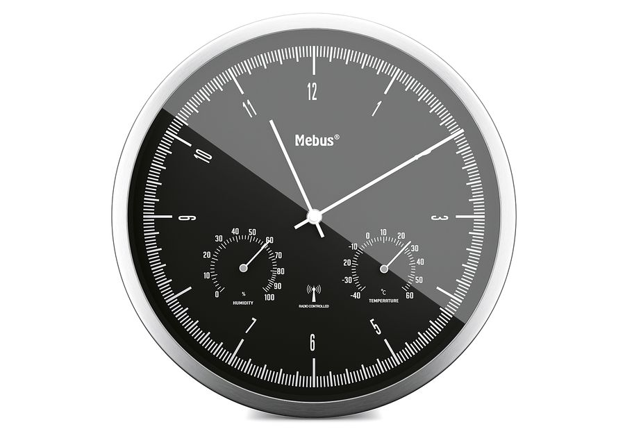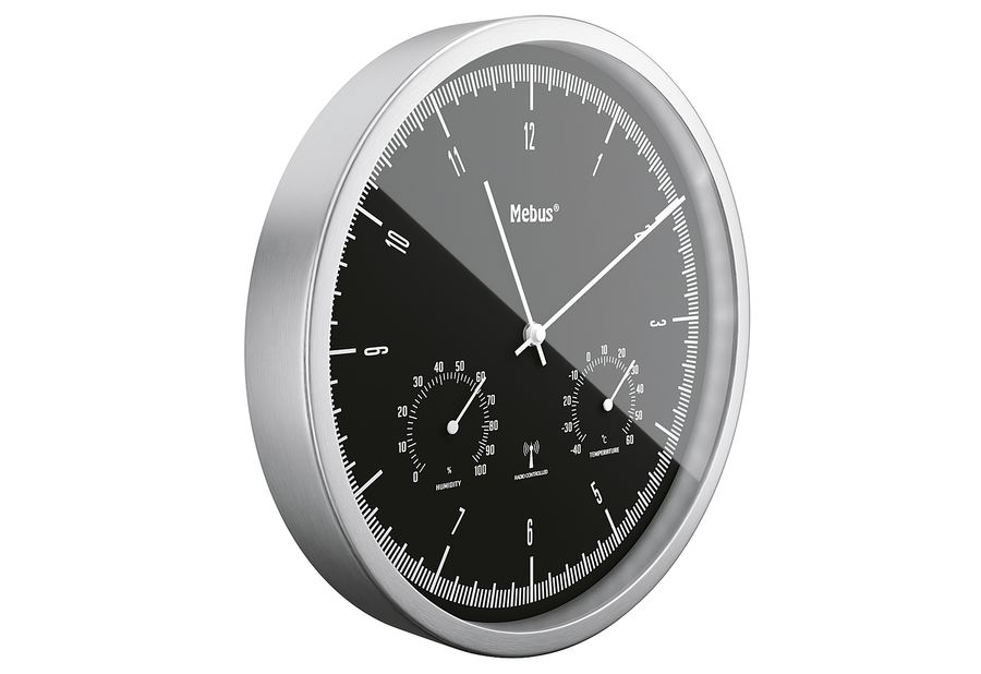 MEBUS Funkwanduhr mit Thermo Hygrometer Ø25cm silber
