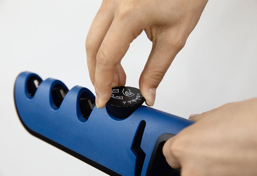 Kunststoff (ABS) / Wolframstahl, 3 in 1: schärft, schleift, poliert Messer in 3 Sek., mit drei innovativen Schleifschlitzen, perfekt für viele unterschiedliche Messertypen und dank eingebauten Scherenschleifers auch ideal zum Schärfen von stumpfen Scheren, über die praktische Stellschraube kann die Neigung der Schleifbakken ganz einfach auf jedes Messer eingestellt werden, kinderleichte Bedienung: einfach durchziehen ohne Kraftaufwand·blau