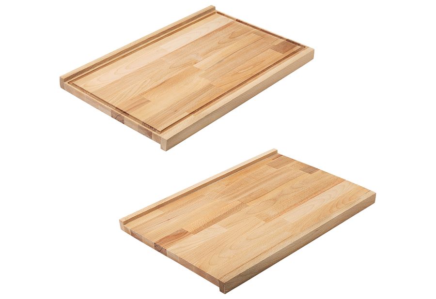 Buchenholz, beidseitig verwendbares Back-und Schneidbrett mit Gegenkantenstopper oder Saftrille und Spritzschutz. (LxBxH): 55x35x2 cm