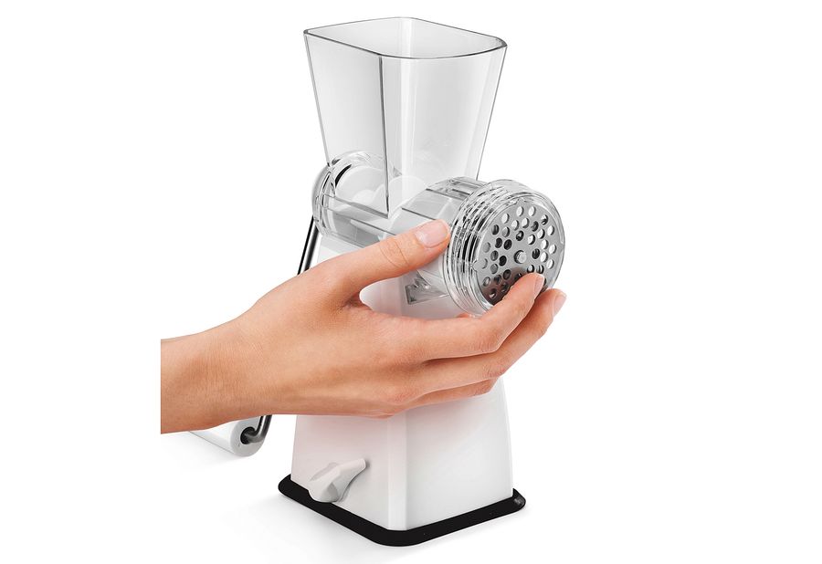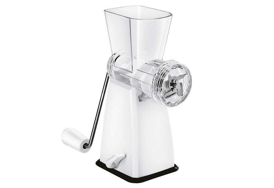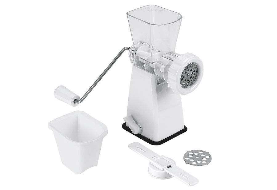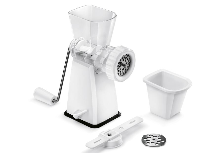 Kunststoff, Inhalt: 2 x Einsätze zum Zerkleinern von Fleisch, Nüssen und Gemüse, 1 x Gebäckeinsatz für Spritzgebäck, Kekse und Nudeln, großer Saugfuß für festen Stand, Sicherheitsriegel zur Befestigung auf glatten Oberflächen für einfaches und sicheres Arbeiten. Für Kinder unzugänglich aufbewahren. Vor Gebrauch spülen.·weiß