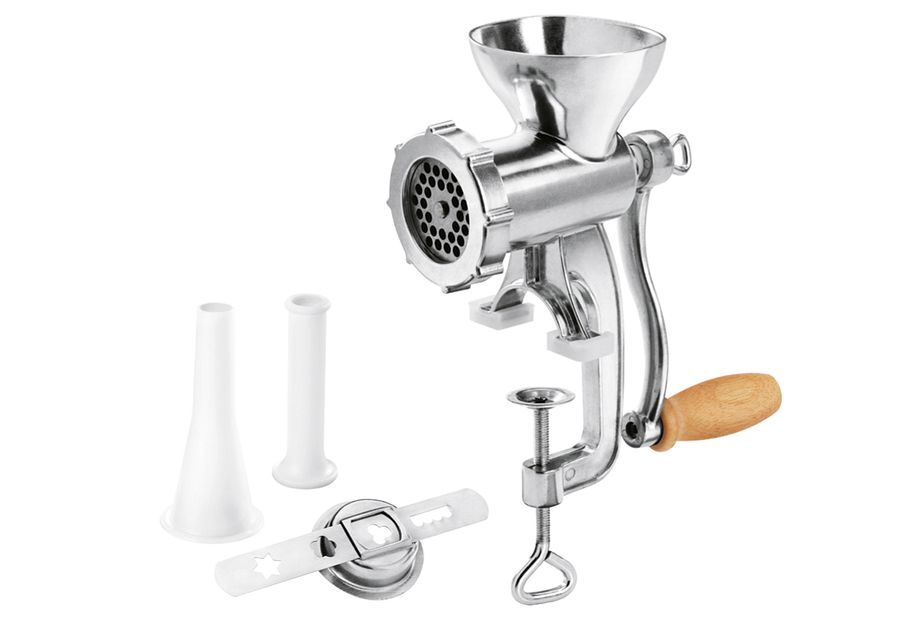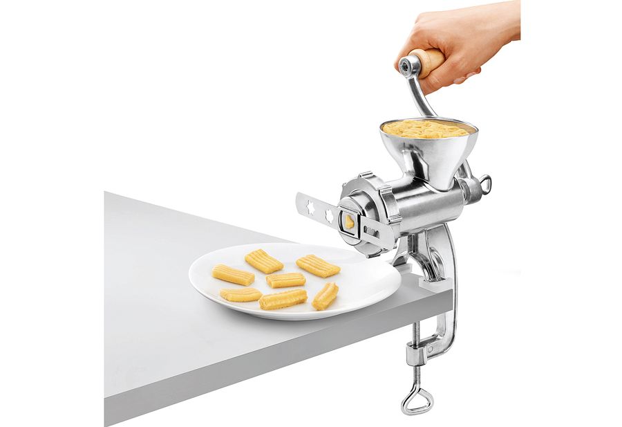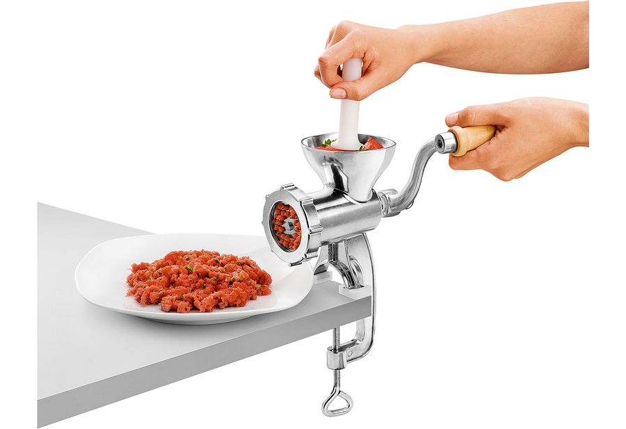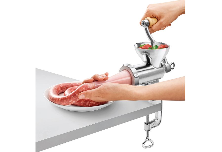 Aluminium / Holz / Kunststoff, Inhalt: Spritzgebäckaufsatz, Wurstfülltrichter und Stößel, mit Holzkurbel und Tischbefestigung, Schnecke aus Hartkunststoff, robust und langlebig, leicht zu reinigen, auch für Arbeitsplatten bis 5,5 cm Stärke geeignet. Mit Sicherheitsschieber für eine sichere Verwendung. Für Kinder unzugänglich aufbewahren. Vor Gebrauch spülen.· (LxBxH): 14,2x9,6x26,3 cm
