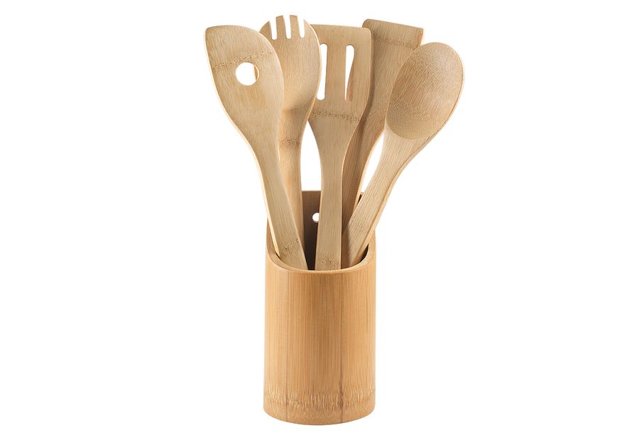 Bambus, Inhalt: Löffel, Wender, Schlitzwender, Löffel mit Loch und Salatlöffel, im Behälter·natur L 32 cm