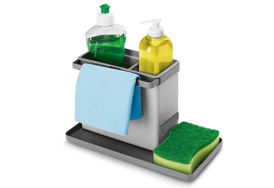 Ideal um alle Spülutensilien an einem Ort zu organisieren, mit 2 ausziehbaren Bügeln für Schwämme oder Spültücherm, der Behälter / Besteckabtropfkorb kann in 5 verschiedenen Positionen auf das Anti-Rutsch-Tablett gesteckt werden·grau (LxBxH): 24x13x14 cm
