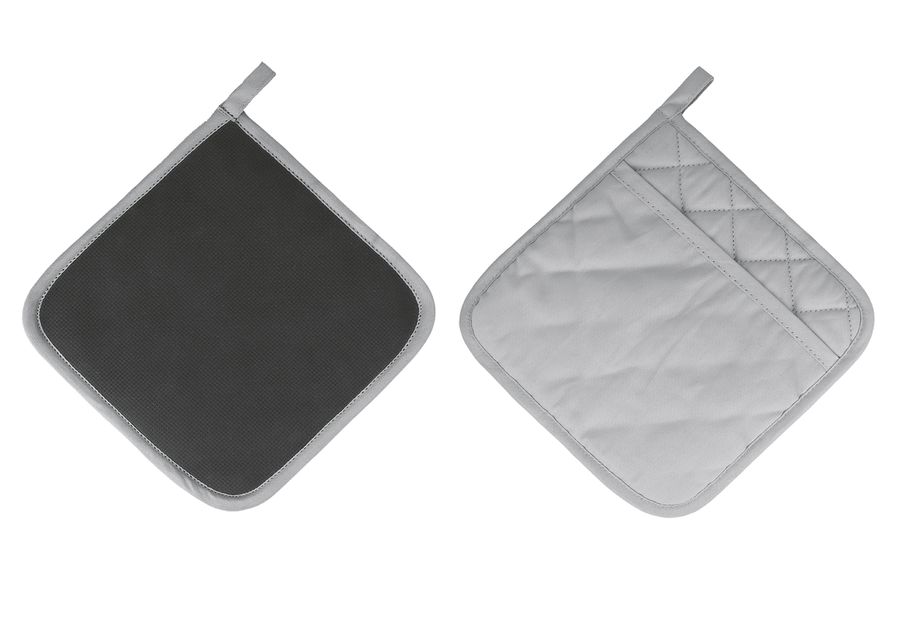 Außen: Baumwolle und Gummi - Innen: Polyester. Wiederverwendbar, nur für den Hausgebrauch, Einheitsgröße. Schützt die Handfläche vor Hitzekontakt mit heißen Oberflächen (Pfannen, Backformen, usw.). Vorsichtig und nur für kurze Momente verwenden. Schützt nicht vor Schnitten, Schürfungen oder Einstichen. Nicht in direkten Kontakt mit Flammen kommen. Nicht geeignet für Lebensmittelkontakt. Hitzebeständig bis max. 250°C.·grau / schwarz L 22 cm