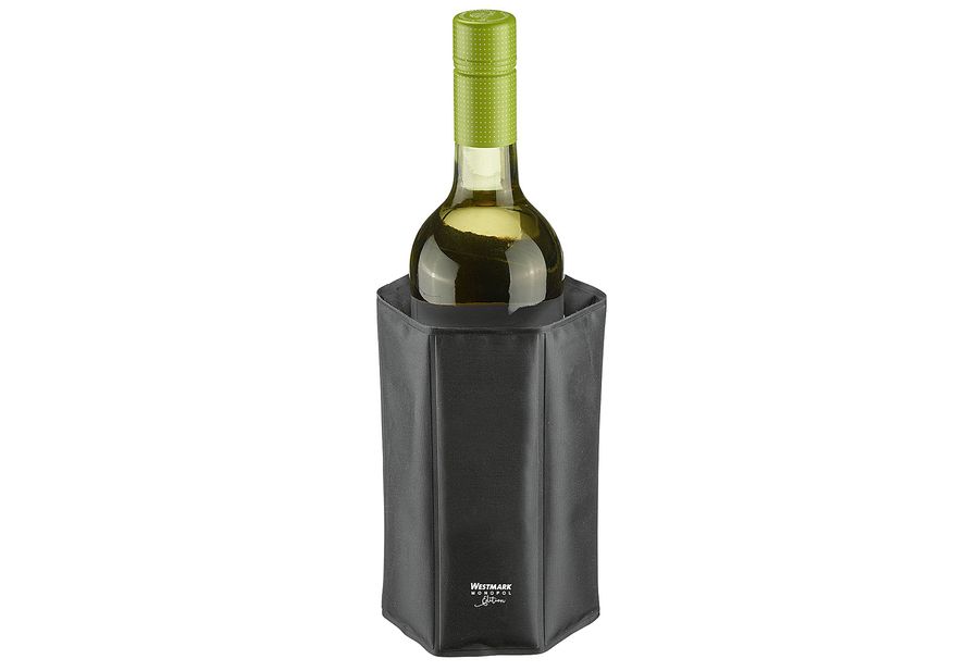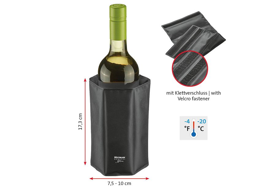 aus pflegeleichtem Polyamid, wasserabweisend, einfach zu reinigen, mit Klettverschluss – variabel zu schließen für Flaschendurchmesser von 7,5 bis zu 10 cm, Anwendung: ca. 3 – 6 h in das Eisfach legen, Hält bis zu 2 h kühl – je nach Umgebungstemperatur