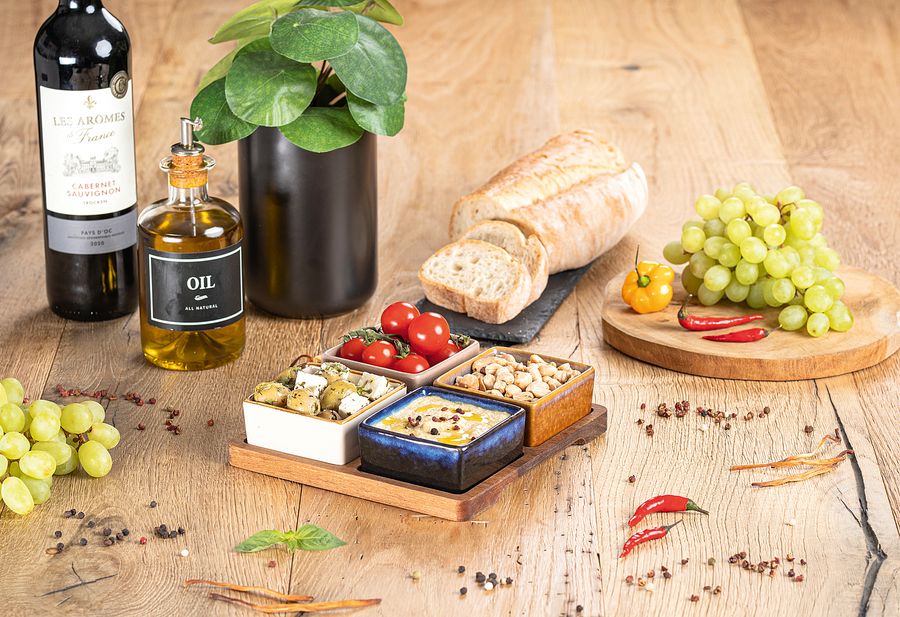 Steinzeug / Akazienholz, FSC-zertifiziert, Inhalt: 1 x Servierbrett, 4 x Schalen (LxBxH): 8x8x3,5 cm, in Geschenkverpackung (LxBxH): 19x19x4,1 cm