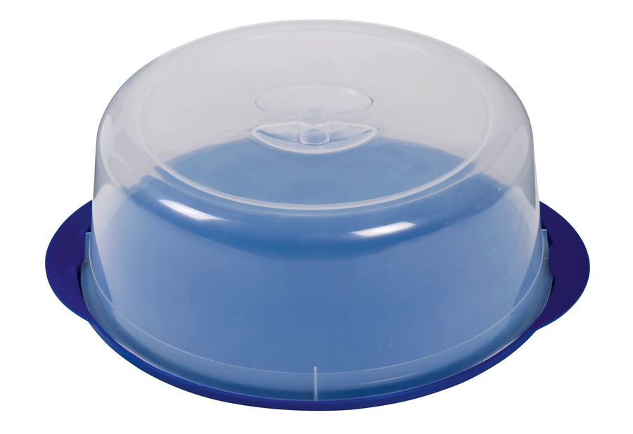Polypropylen, mit Serviertablett und Verriegelung, die große, stabile und nur schwer zerbrechliche, transparente Haube kann sicher mit dem Serviertablett verbunden werden, auf diesem ist zum einfachen Einteilen der Tortenstücke eine Schnittlinie markiert, von -40° bis +95° einsetzbar· Ø 35 cm, H 12 cm