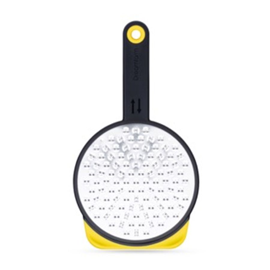 Der Ograte ist eine Reibe mit Klingen auf Vorder- und Rückseite. Durch die besondere Anordnung der Klingen ist das Reiben auf der Vorderseite durch kreisförmige Bewegungen in kurzer Zeit erledigt, die zweischneidigen Klingen auf der Rückseite ermöglichen das Reiben durch eine Auf- und Abbewegung, wodurch auch Lebensmittel wie Hartkäse oder Schokolade schnell gerieben werden können. Die besonders große Reibefläche ermöglicht das Reiben von großen Lebensmitteln wie Kohl und Zwiebeln. Der Silikonfuß an der Unterseite sorgt während des Reibens auf glatten Flächen für Stabilität, und kann durch die durchgehende Kante das Geriebene zusammenkratzen. Durch die Form des Fußes lässt sich der Ograte auch mühelos an den Rand einer Schüssel oder Schale hängen, um so die Zutaten direkt in z.B. einen Teig zu reiben. Der einzigartige Klingenschutz klickt sich sicher am Rand des Ograte fest und schützt so beide Seiten der scharfen Reibeoberflächen, um ihn so sicher platzsparend in ihren Schubladen zu verstauen.