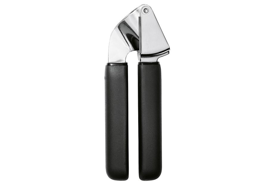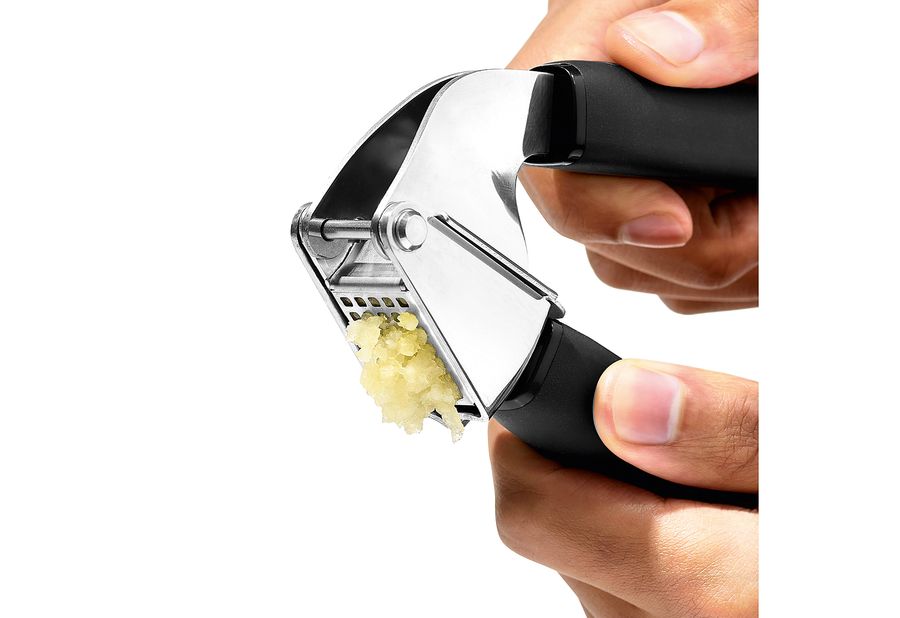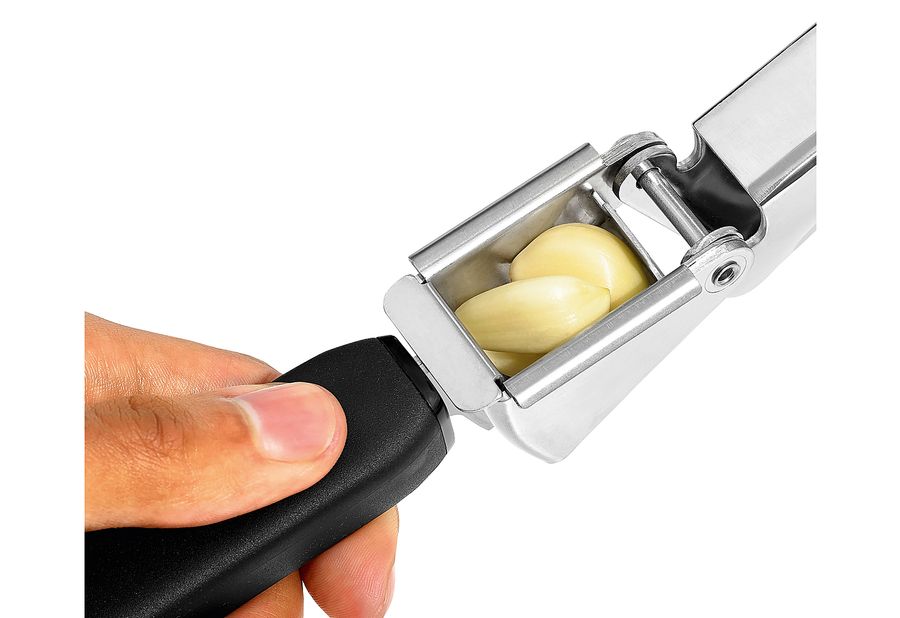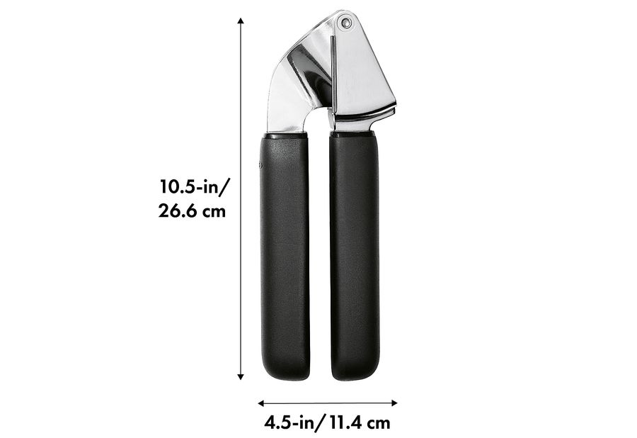 Nylon / Kunststoff (PP,TPE) / Zinkdruckguss, mit großem Knoblauchfach, um mehrere Knoblauchzehen gleichzeitig zu Pressen, eine eingebaute Reinigungsvorrichtung ermöglicht einfaches Reinigen, die weichen Griffe sind leicht geschwungen und absorbieren den Druck, spülmaschinenfest·schwarz (LxB): 26,6x11,4 cm
