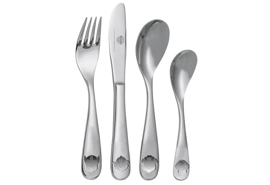 18/10 Edelstahl rostfrei, Inhalt: Messer, Gabel, Suppenlöffel, Dessertlöffel, angesagtes Paw Patrol Motiv, Messer L ca. 18,5 cm: Prägung "Chase", Gabel L ca. 17,5 cm: Prägung "Marshall", Suppenlöffel L ca. 17,5 cm: Prägung "Rubble", Kleiner Dessertlöffel L ca. 14,5 cm: Prägung "Skye", spülmaschinengeeignet, nicht mikrowellengeeignet, im Geschenkkarton Karton (LxBxH): 3x14x20,5 cm