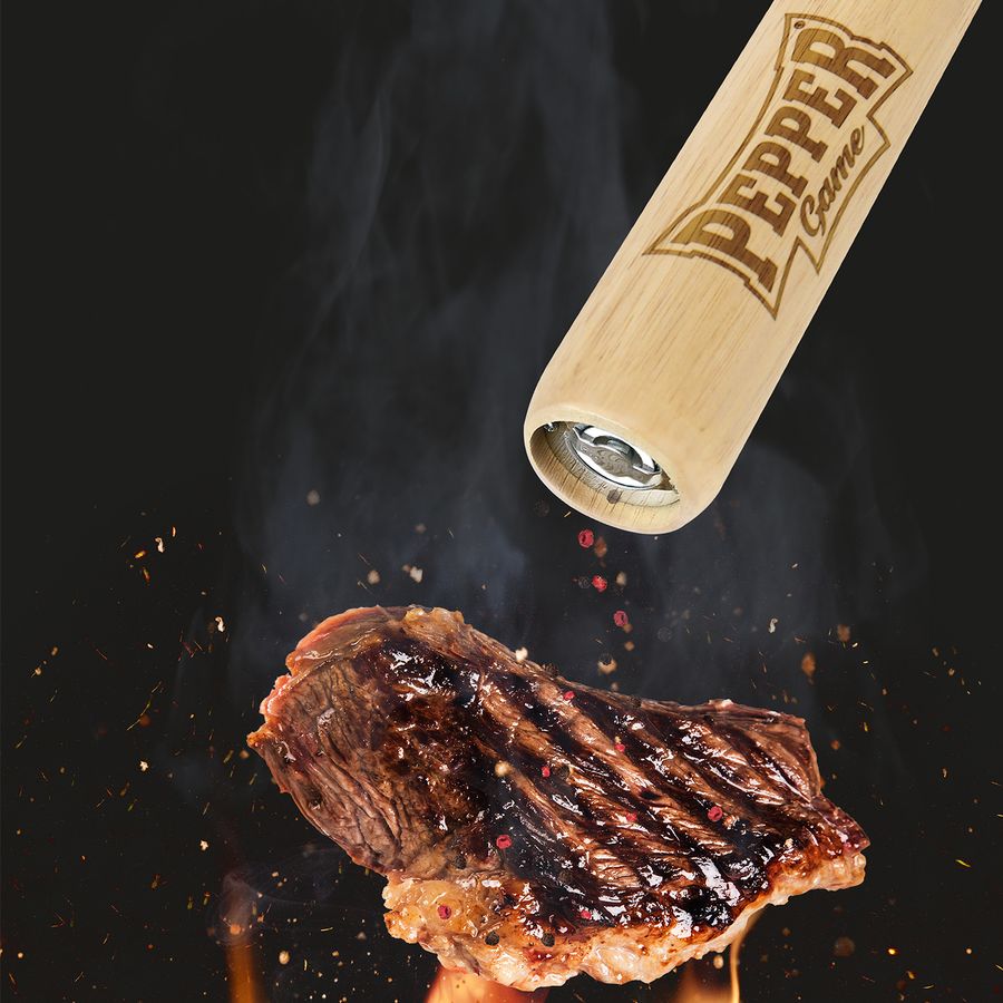 m Garten beim BBQ, bei Feiern am Tisch oder beim Besuch der Freunde - der Pepper Game setzt immer einen Accent in der Runde und sorgt für genügend Spaß. Die ausgefallene Optik und die immense Größe sorgen immer für die erwünschte Aufmerksamkeit. Der starke und innovative Mahlmechanismus aus Keramik, welcher das Mahlgut so zerbricht, dass die intensiven Aromen erhalten bleiben, ist optimal für den Einsatz bei der Verfeinerung Ihrer Steaks oder generell aller anderen Gerichte. Das durchdachte Pepper Game Design ist darauf bedacht nur mit hochwertigen Materialen gefertigt zu werden und Plastik im Produkt zu vermeiden. Das Holz des Schlägers besteht aus Gummibaumholz und die Metallelemente sind aus Edelstahl. Das eingebrannte Logo spiegelt die Wertigkeit des Produktes wider. Das Befüllen des Pepper Game ist ein Leichtes. Zur Anbringung an die Wand ist dem Pepper Game eine Wandhalterung aus Edelstahl, inklusive einer Schraube und einem Dübel, beigelegt. Die Wandhalterung ist klassisch zurückhaltend geformt und bietet dem Pepper Game die Möglichkeit auch an der Wand, einer Säule oder ähnlichen Bereichen, eine gute und ansprechende Präsentation. Ein ernst zu nehmender Spaß, für Groß und Klein, für den Küchenchef oder Demjenigen, der es werden will, in jeder Gesellschaft. Der Pepper Game ist auch als Geschenk zu Geburtstagen, an Weihnachten oder zu Feiern immer die richtige Wahl.