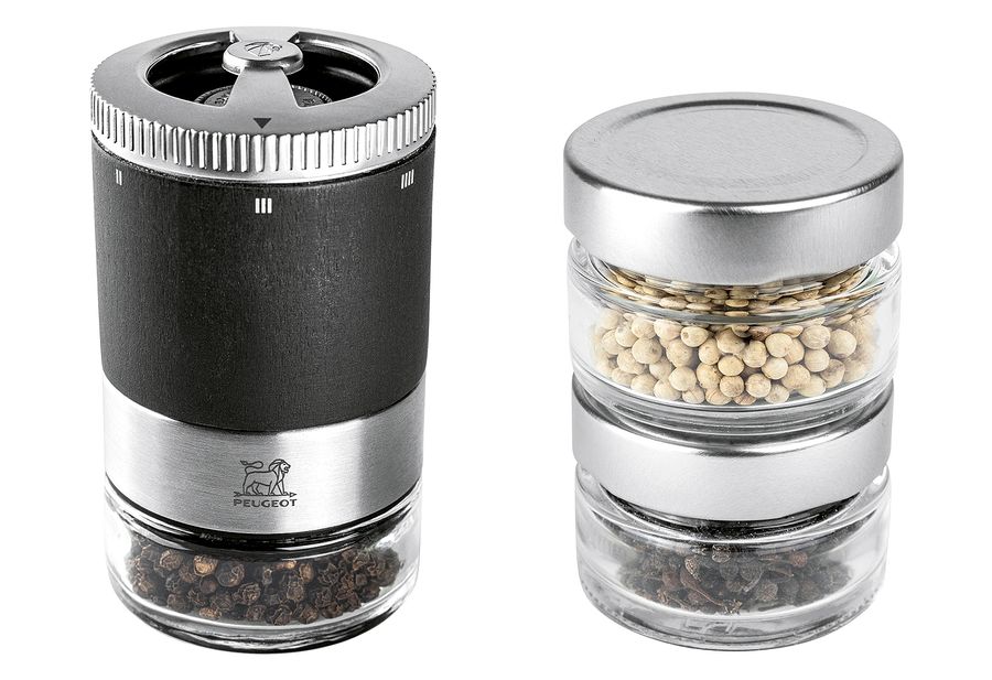 Stahl / Glas / PEFC-zerfiziertes Holz, Stahlmahlwerk, austauschbare Behälter aus Glas, präzise Mahlgradeinstellung durch patentiertes U-Select-System, 3 erlesene Pfeffersorten, 1 Rezeptbuch, 1 Stift·graphit Pfeffermühle: L 11 cm·Fachhandel exklusiv