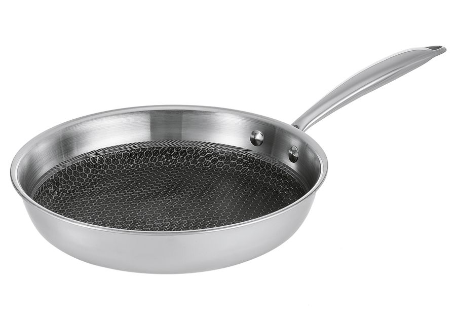 3-lagige Wände und Boden (Edelstahl + Aluminium + Edelstahl), Gehäusestärke - 2 mm, Bodenstärke - 2 mm, Wabenstrukturboden, ergonomischer Metallgriff, Energieeinsparung 25%, spülmaschinenfest, für alle Herdarten geeignet, einschließlich Induktion, backofenfet bis 220 °CK Ø 24 cm, H 5 cm