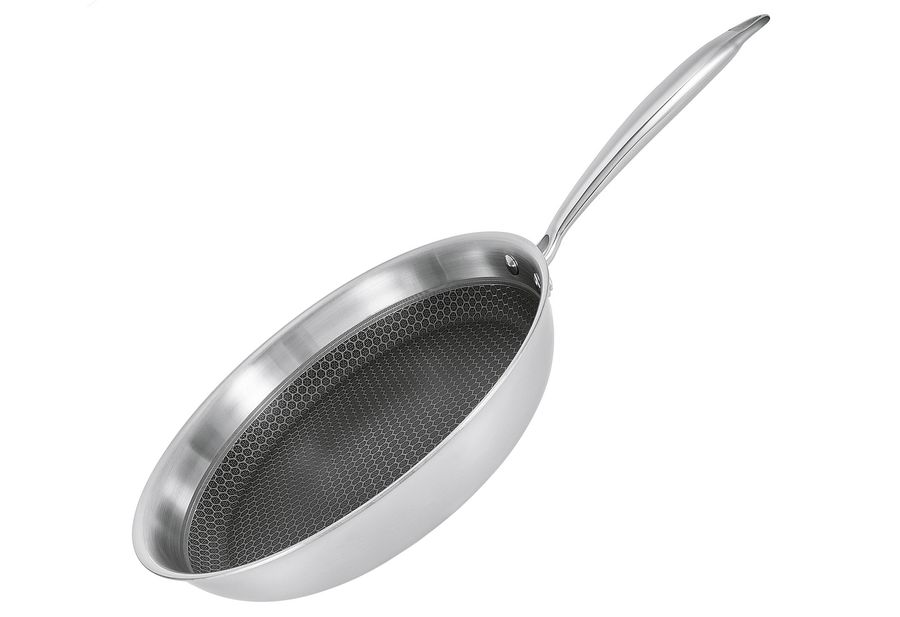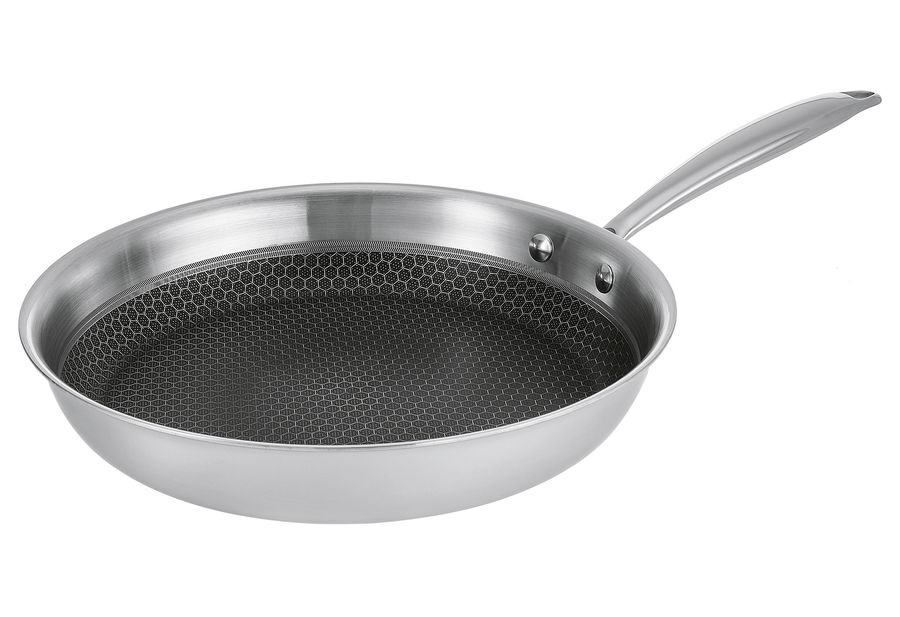 3-lagige Wände und Boden (Edelstahl + Aluminium + Edelstahl), Gehäusestärke - 2 mm, Bodenstärke - 2 mm, Wabenstrukturboden, ergonomischer Metallgriff, Energieeinsparung 25%, spülmaschinenfest, für alle Herdarten geeignet, einschließlich Induktion, backofenfet bis 220 °CK Ø 28 cm, H 5,5 cm