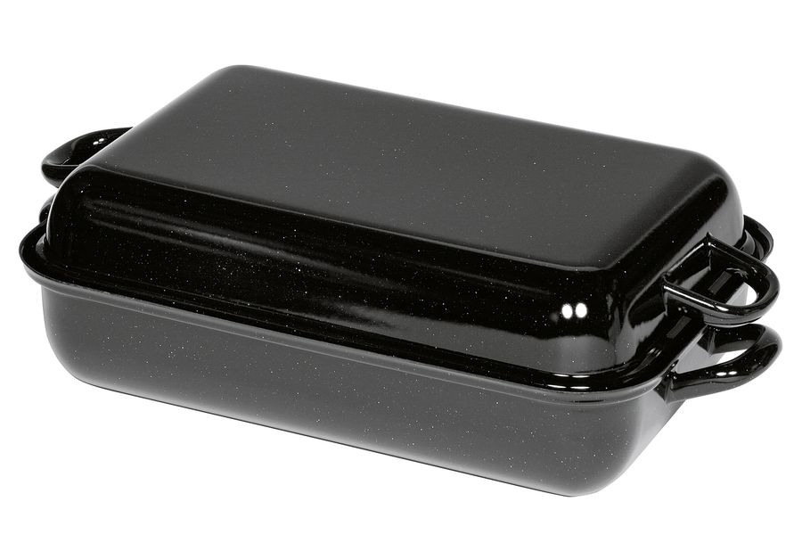 Schwarzemaille, mit Deckel, mit zwei emaillierten Griffen für einfaches Hantieren, gut schließender Deckel mit Griff, der ebenfalls als Bratform dienen kann, Innenmaße 31 × 21 cm, Außenmaße 38,5 × 21,8 cm (mit Griff), schnitt- und kratzfest, für energiesparendes Kochen, backofengeeignet, hitzebeständig bis 450°C – maximal empfohlene Betriebstemperatur bei 220°·schwarz (LxBxH): 32x22x13,1 cm