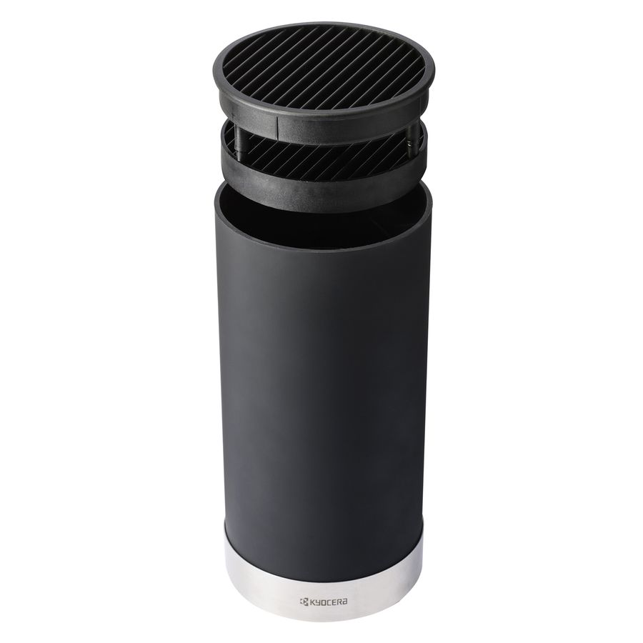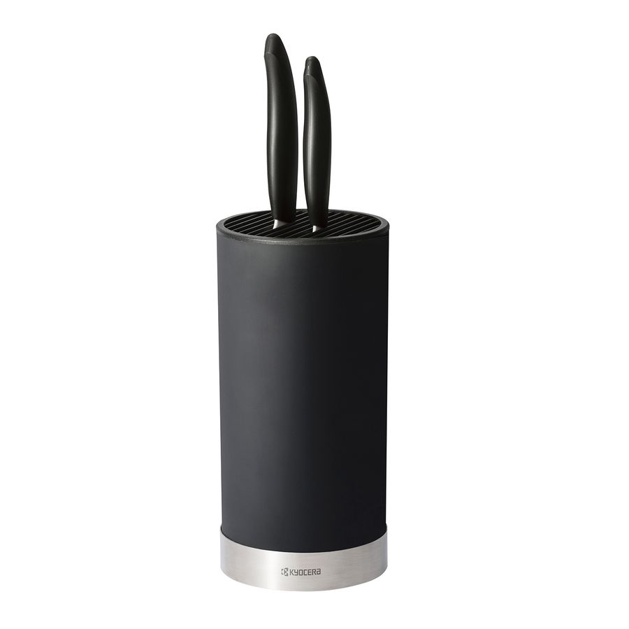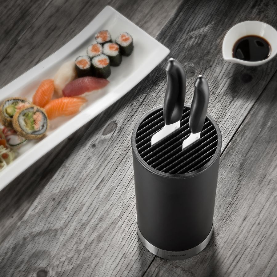 Kyocera präsentiert einen Messerblock, der anders ist als andere. Sein Design fällt durch die elegante runde Form in edlem Schwarz auf und wird so zum Stilmerkmal in der Küche. Schön auch das hochwertige Band aus Edelstahl, auf dem das Kyocera-Logo eingraviert ist! Insgesamt verfügt der Block über Messeschächte, in denen sechs bis acht Messer sicher platziert werden können.