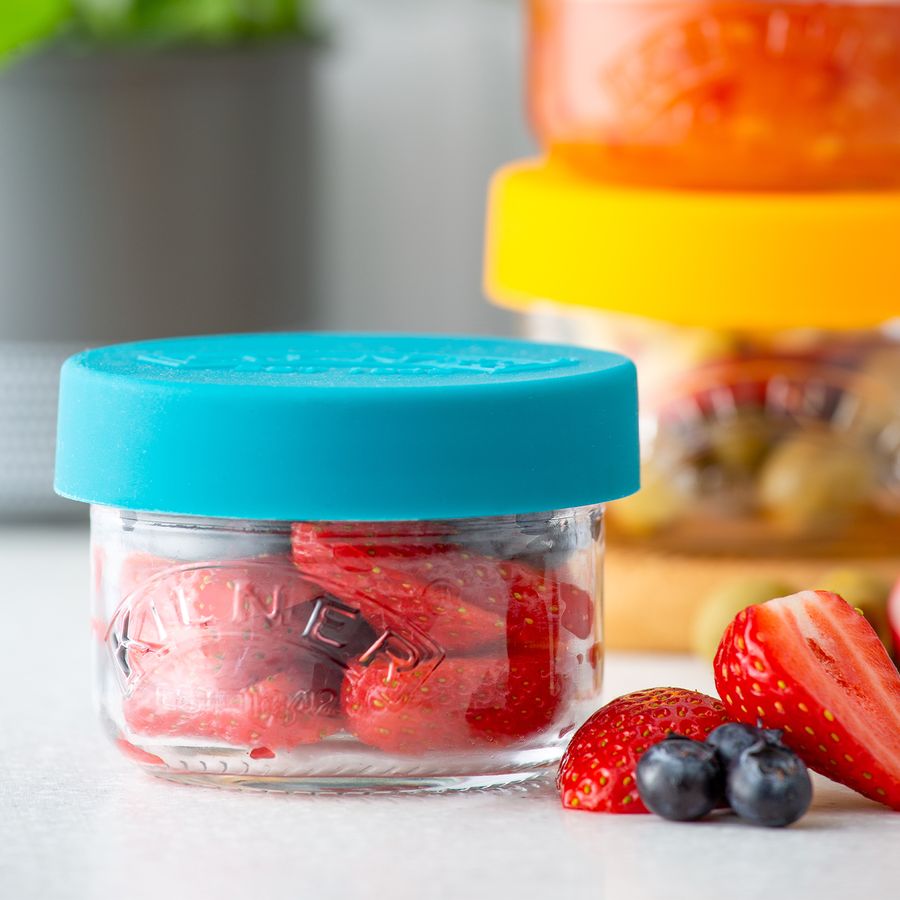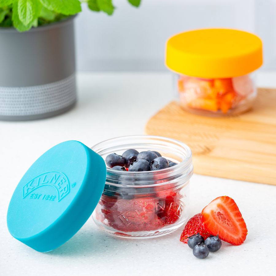 Das Kilner 2er Set Snackgläser ist ideal für das Aufbewahren und Transportieren von Nüssen, Obst, Gemüse und anderen kleinen Snacks – perfekt für Schule, Sport und Freizeit. Auch ideal zum Aufbewahren von Samen, Gewürzen, Kräutern und mehr. Die leicht aufsteckbaren Silikondeckel verschließen luftdicht und auslaufsicher, somit eignen sich die Gläser auch für flüssige Inhalte zum Transport oder zur Aufbewahrung. Das 2er Set beinhaltet zwei Gläser mit Deckel in zwei Farben. Beides ist spülmaschinengeeignet. Fassungsvermögen: 2 x 125 ml.