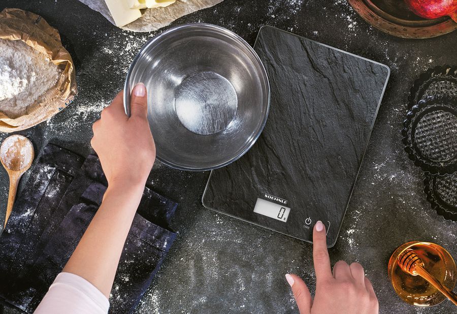 5 kg Tragkraft, umschaltbar zwischen g und oz / lb, gut lesbarer LCD-Display (1,2 cm Ziffernhöhe), Zuwiegefunktion (Tara), Sensor Touch, platzsparend, Aufhängevorrichtung, Batterie inklusive 1 x 3 V CR2430, rutschhemmende Füße, automatische Abschaltfunktion, Batteriefach kindersicher und verschraubt, Schiefer-Naturoptik·slate (LxBxH): 20x15x1,3 cm