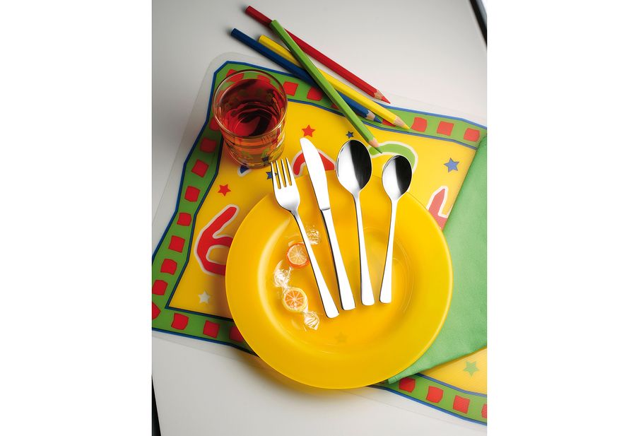 Edelstahl / Messer in Chromstahl, Inhalt: Kinderlöffel (15,5 cm), -gabel (15,5 cm), -messer (ohne Wellenschliff)(17 cm), Teelöffel (13,9 cm), spülmaschinengeeignet, für Kinder ab 3 Jahre geeignet, in Geschenkverpackung Verpackungsmaß: (LxBxH): 14,5x18,5x2 cm