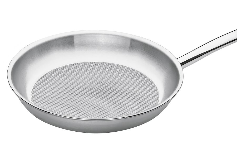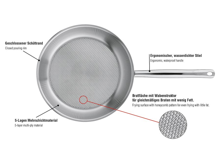 5-Lagen Mehrschichtmaterial Außenschicht aus, induktionstauglichem Edelstahl 18/0, innen, Edelstahlschicht 18/10 und dreifachem, Aluminiumkern., Erhabene Wabenstruktur aus Edelstahl. Geeignet, für Pfannenwender aus Metall., Optimale Wärmeverteilung., Geeignet für sämtliche Herdarten inklusive, Induktion. Backofenfest., Geschlossener Topf- und Schüttrand., Ø 24 cm / Höhe: 4,0 cm H 4 cm, Ø 24 cm·Fachhandel exklusiv