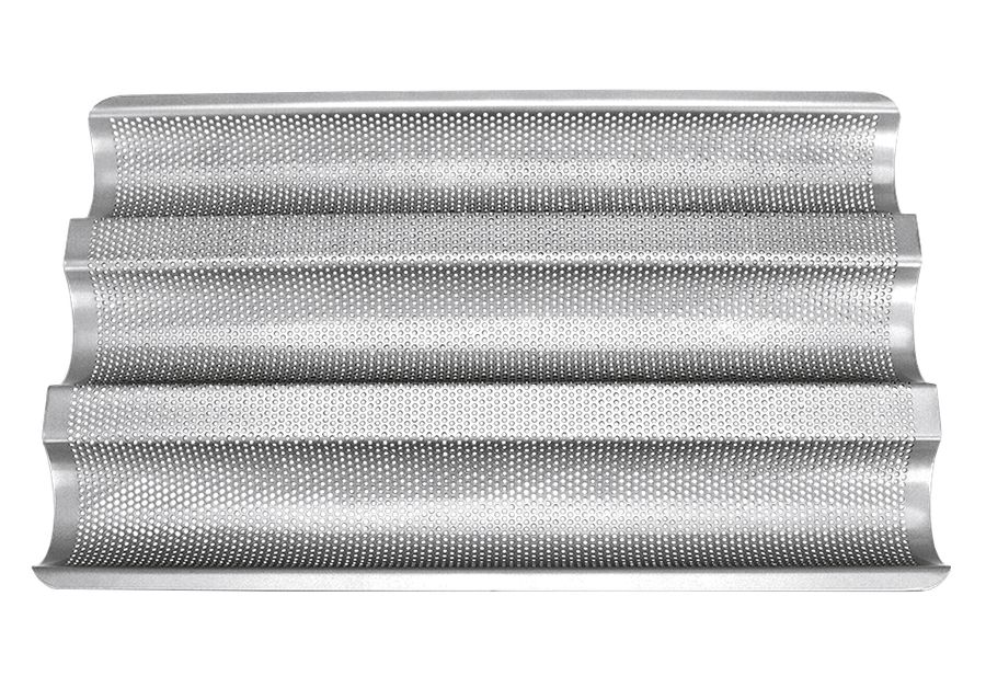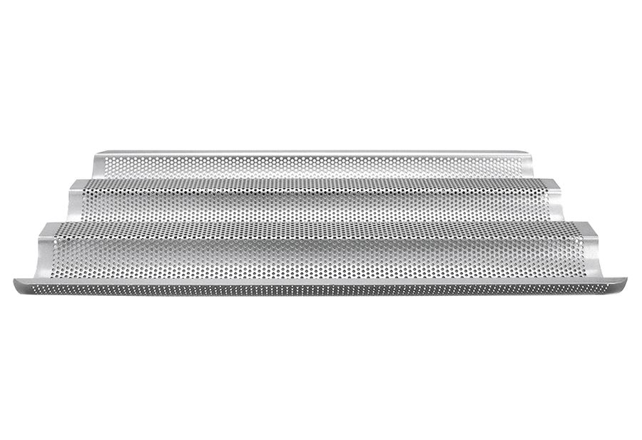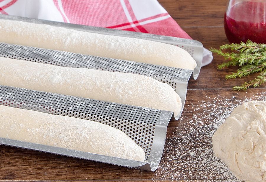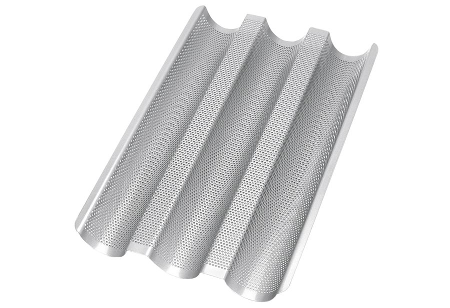 Metall, für 3 Baguette, hochwertige und langlebige Antihaftbeschichtung, leichtes Auslösen, temperaturbeständig bis 250 °C, mit Rezept (LxBxH): 37x24x2,5 cm