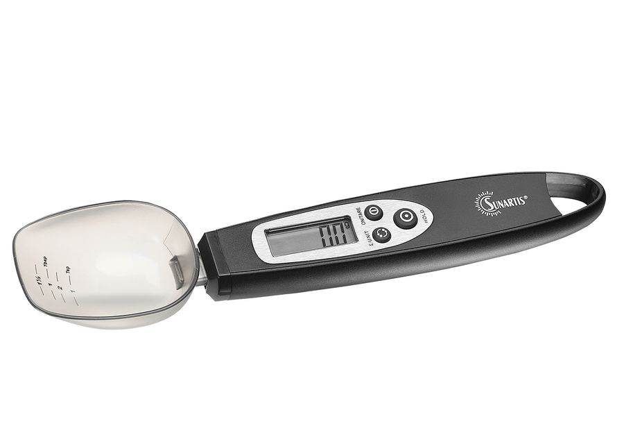 aus hochwertigem ABS Kunststoff, digital, mit LC Display, Ideal zum Wiegen von Butter, Mehl, Sahne, Gewürzen, Öl, Zucker, Tee, beim Backen und Kochen, umschaltbar von Gramm auf Unzen, Batteriebetrieb mit geringem Energieverbrauch, mit abnehmbarem, spülmaschinenfestem Löffel, Haltefunktion der Anzeige im Display, mit stufenweiser Addierfunktion bis max. 3000 g, Löffelvolumen: 28,4 ml , Markierung für Ess (Tbsp)- und Teelöffel (Tsp), automatische Abschaltung nach ca. 2 Minuten bei Nichtverwendung der Knöpfe, 0,1 g Auflösung, inkl. 1x 3-V-CR-2032 Batterie·schwarz L 23 cm