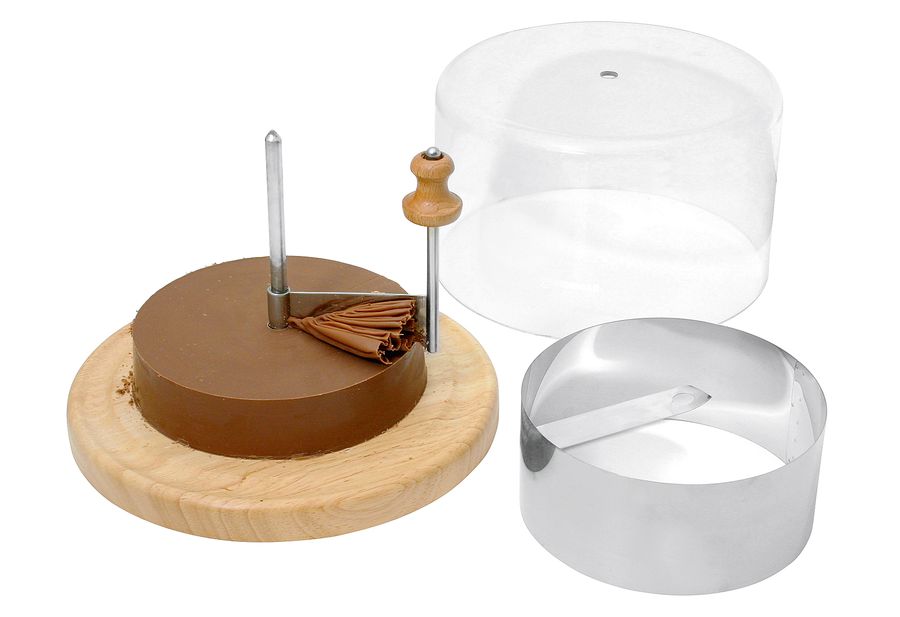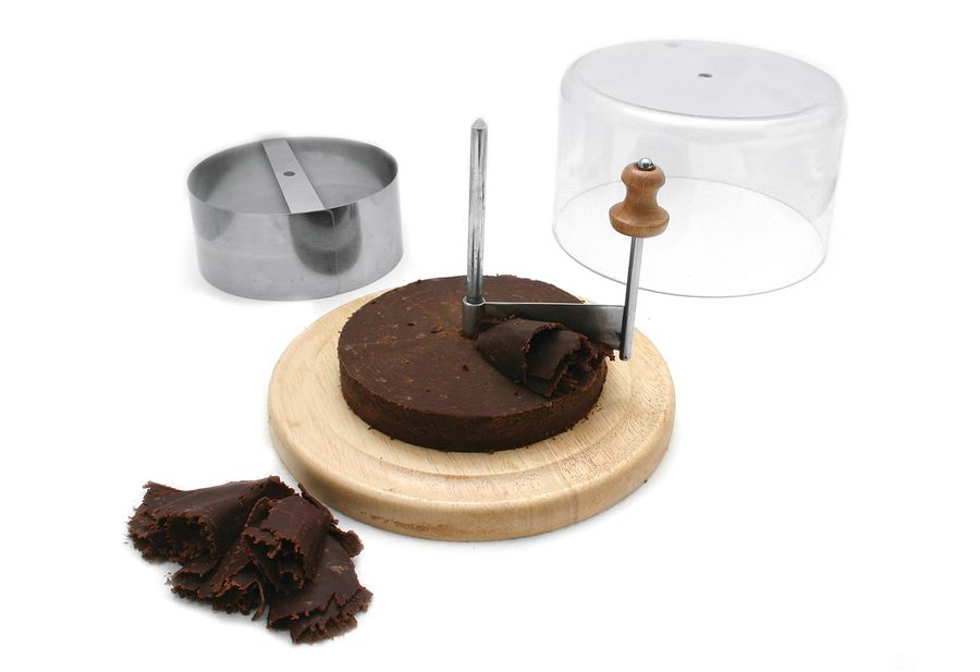 Edelstahl, Inhalt: 1 Edelstahlklinge mit Holzsockel, 1 Edelstahlform, 1 Frischhaltehaube, zum Herstellen von feinen Käse oder Schokoblättchen, die scharfe Klinge am schwenkbaren Griff raspelt Käse und Schokolade in dünne Blättchen, die Edelstahlform vereinfacht das Formen geschmolzener Schokolade·silber Ø 22 cm, H 6,8 cm·Fachhandel exklusiv·